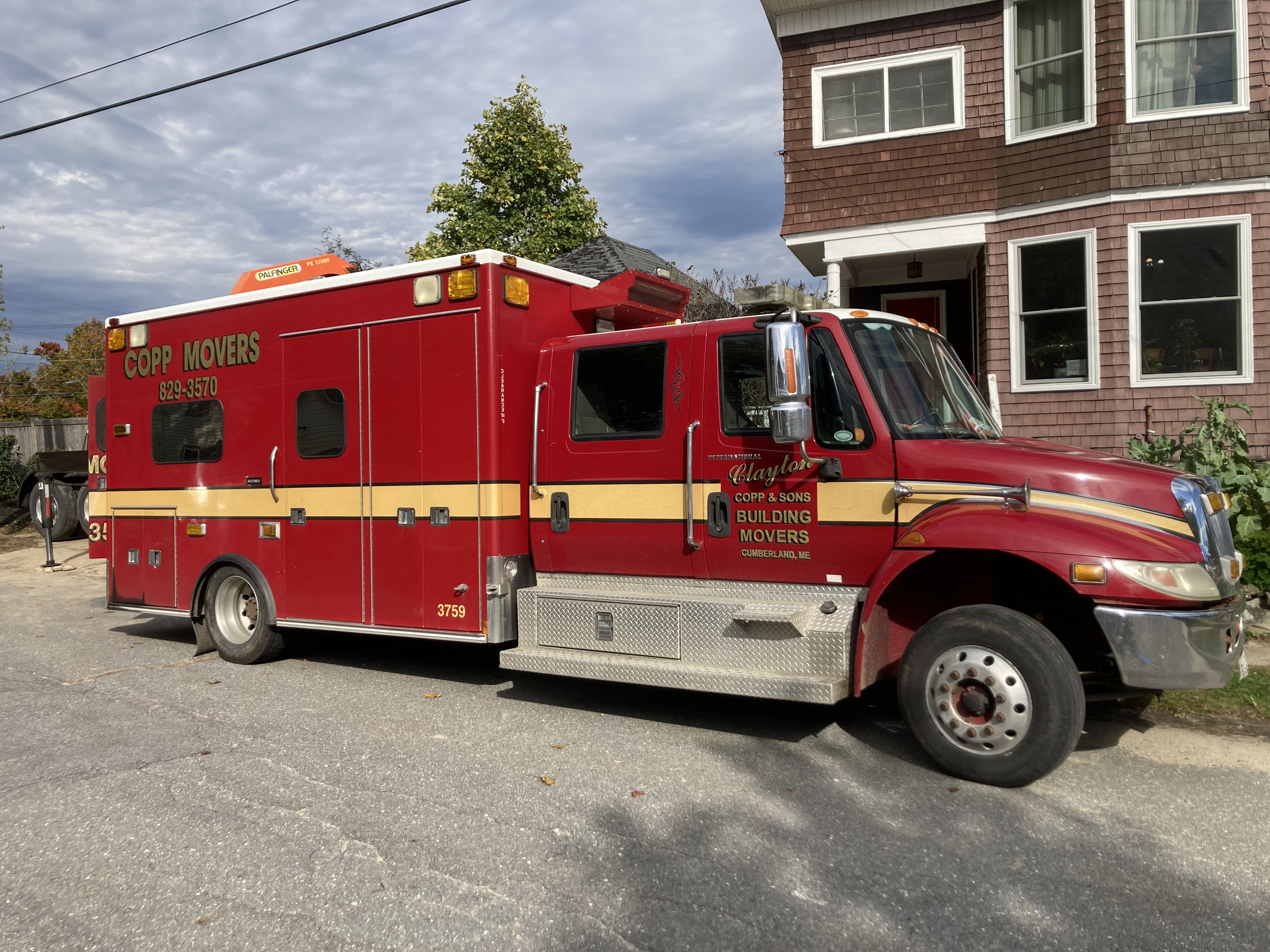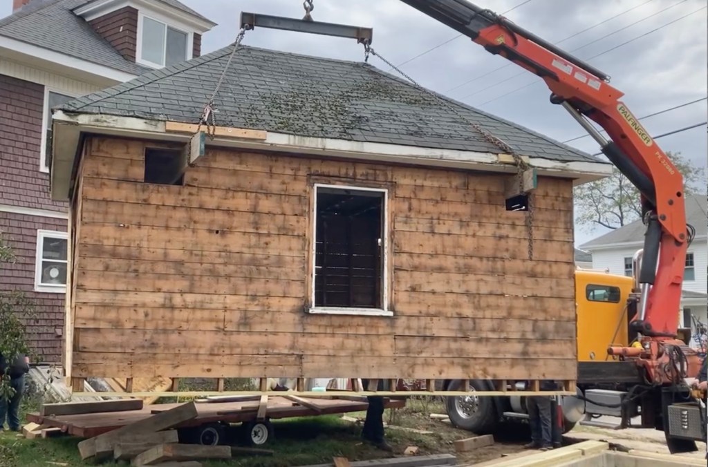 The Copp Brothers from Cumberland accomplished this Herculean task. For three generations they have been jacking and moving buildings and, like the “Ghostbusters,” the Uncles and Nephews arrived in a converted ambulance filled with tools of their trade. In less than 90 minutes they rolled the structure onto the street and onto the side yard. The crane lift back took less time.