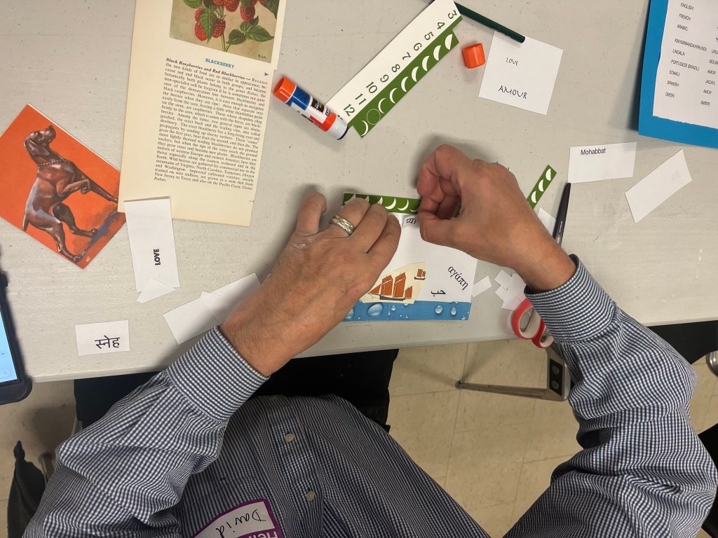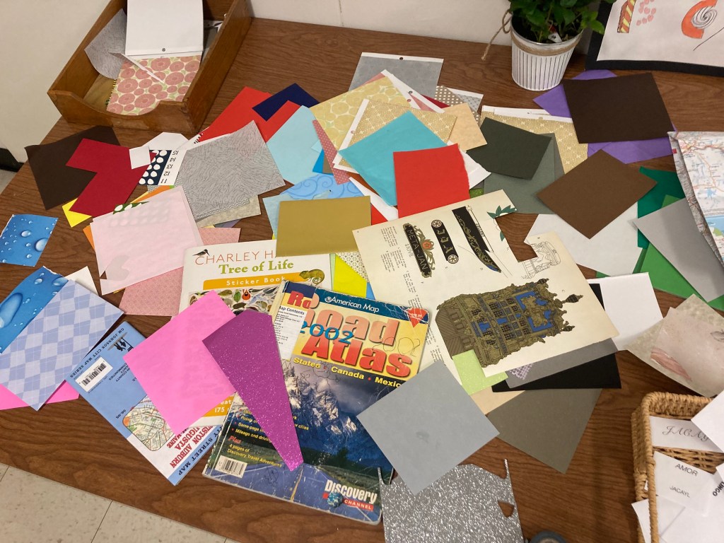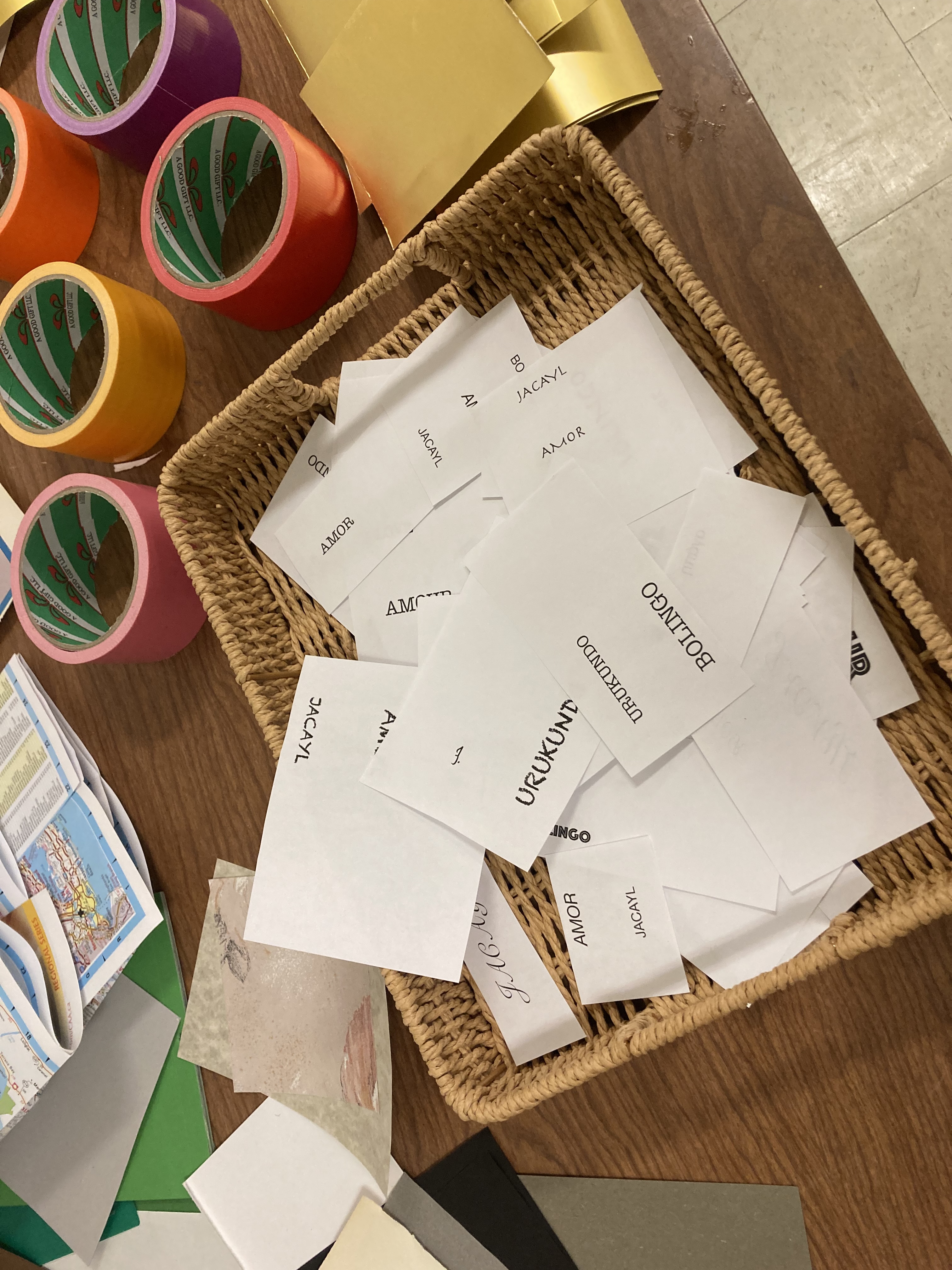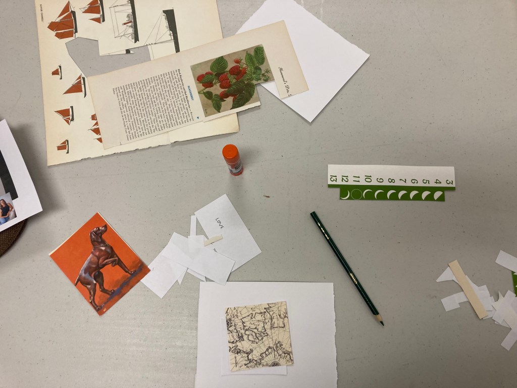 I participated in one 45-minute session, gluing images of the Moon cycle, cutouts from old picture books, and “love” from 10 different languages. 7 other women participated, one of whom was older and wore delightfully eccentric glasses, while the other 6 were young women from a “sober house.” Everyone was engaged, focused silently on their work. At the end we walked about looking at each others’ creations, all of which were as varied and diverse as the forms and expressions of love. There was a deep sense of connection in a non-verbal form.