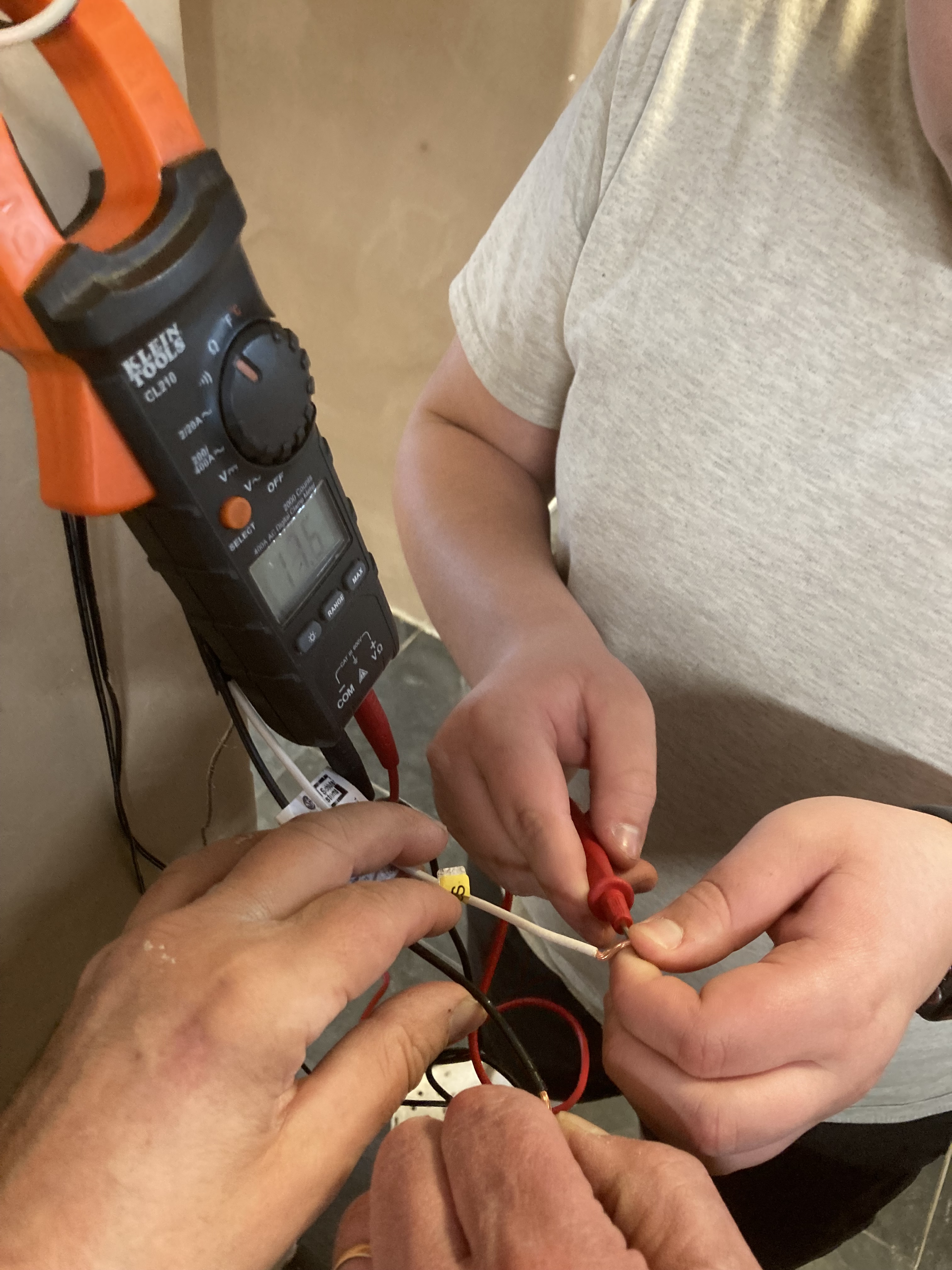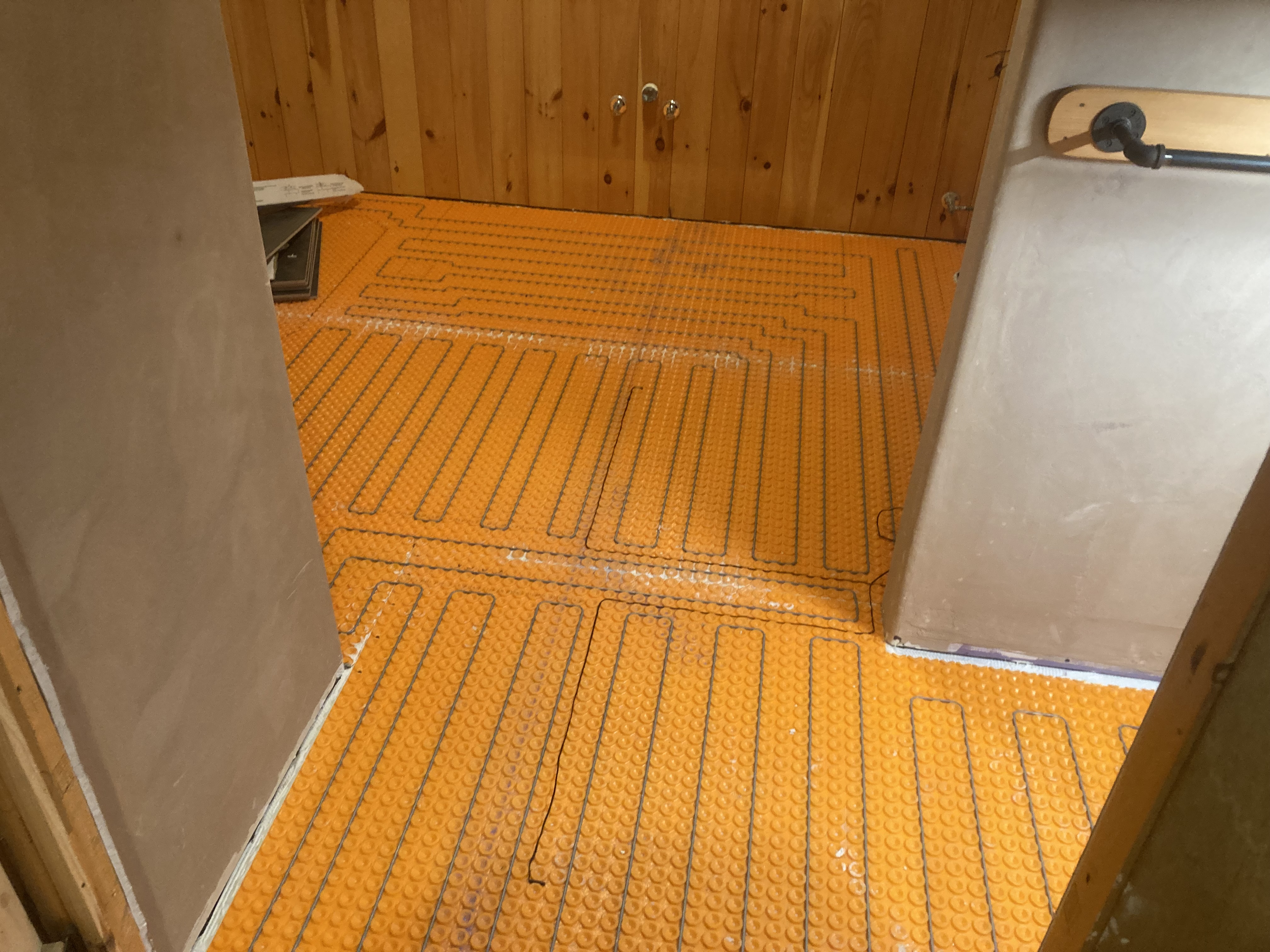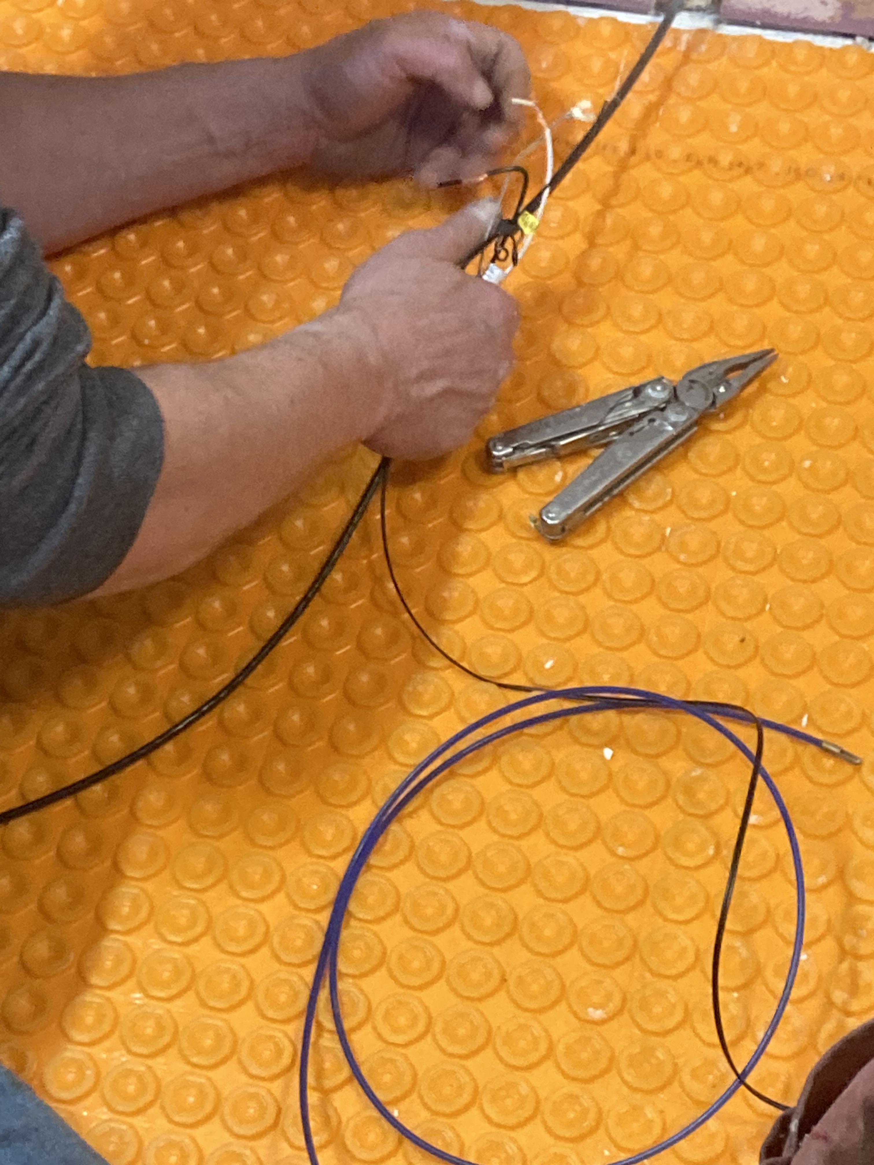 To install the radiant floor heating cable, we made multiple tests of “conductor resistance” to ensure the circuit was functional. We used the Professor’s megohmmeter to take an ohms reading between the two power leads. At the factory the cable tested 14.8 ohms, but our test before installation was 14.1, after cable installation was 14.2, and after tile installation was 13.4. The manufacturer allows a 10% variance, so we remain within that range. Our test was positive and we proceed.