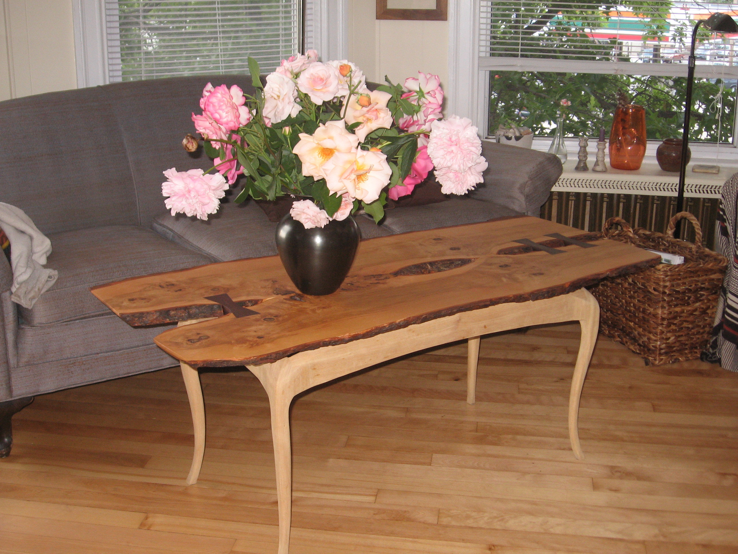 Coffee table made of black alder, with a satinwood base and dovetail keys of padauk. This was made in January 2006.