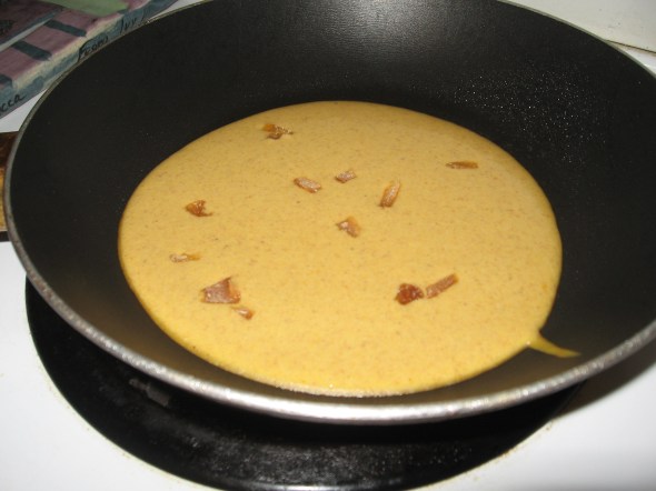 Dice the ginger and keep in bowl by your stove. Combine all the wet ingredients together in one bowl and mix. Add all of the dry ingredients together in large separate bowl and mix. Add the wet to the dry and whisk until lumps have mostly broken up. Once batter is ladled into pan, drop pieces of ginger into the pancakes.