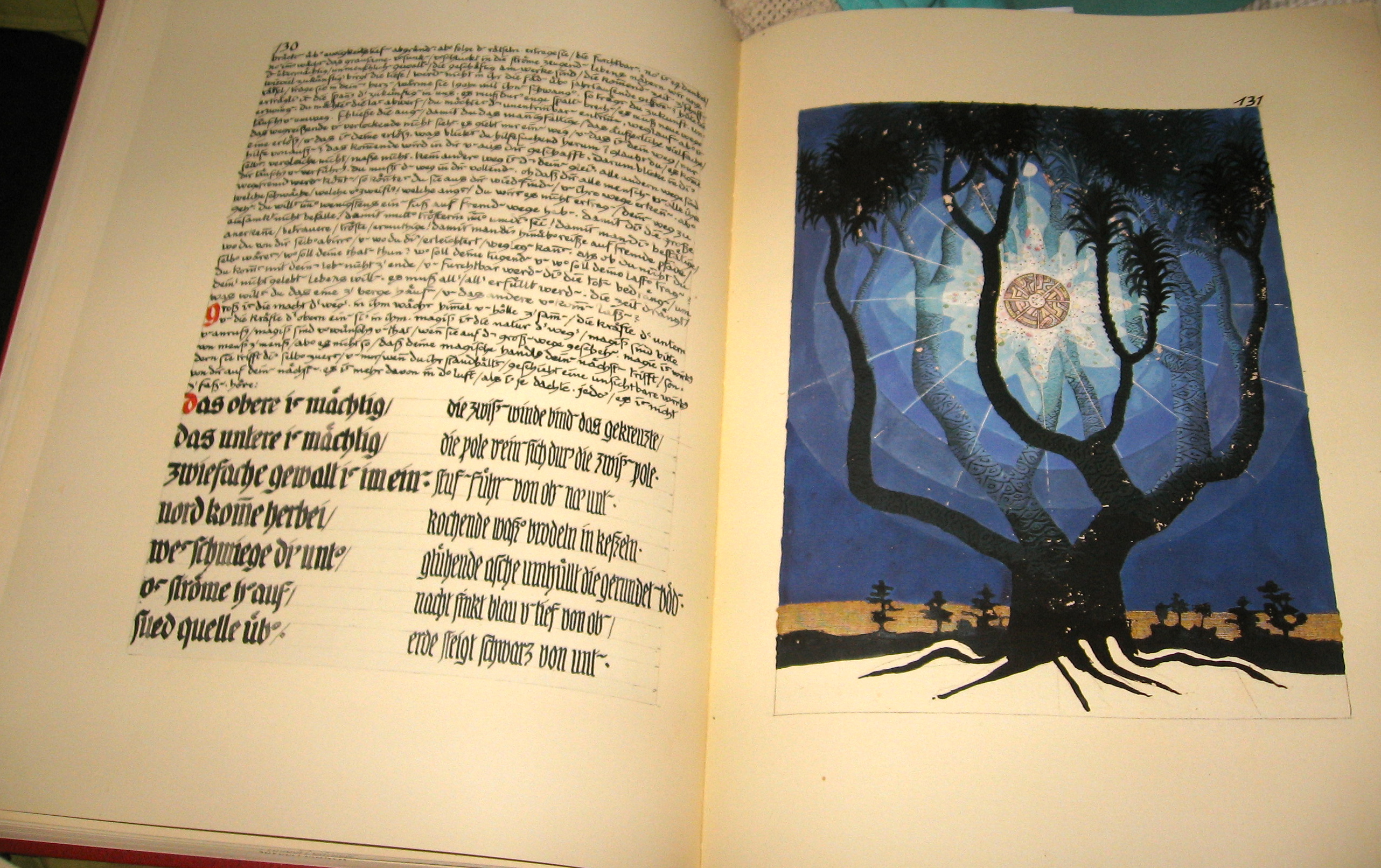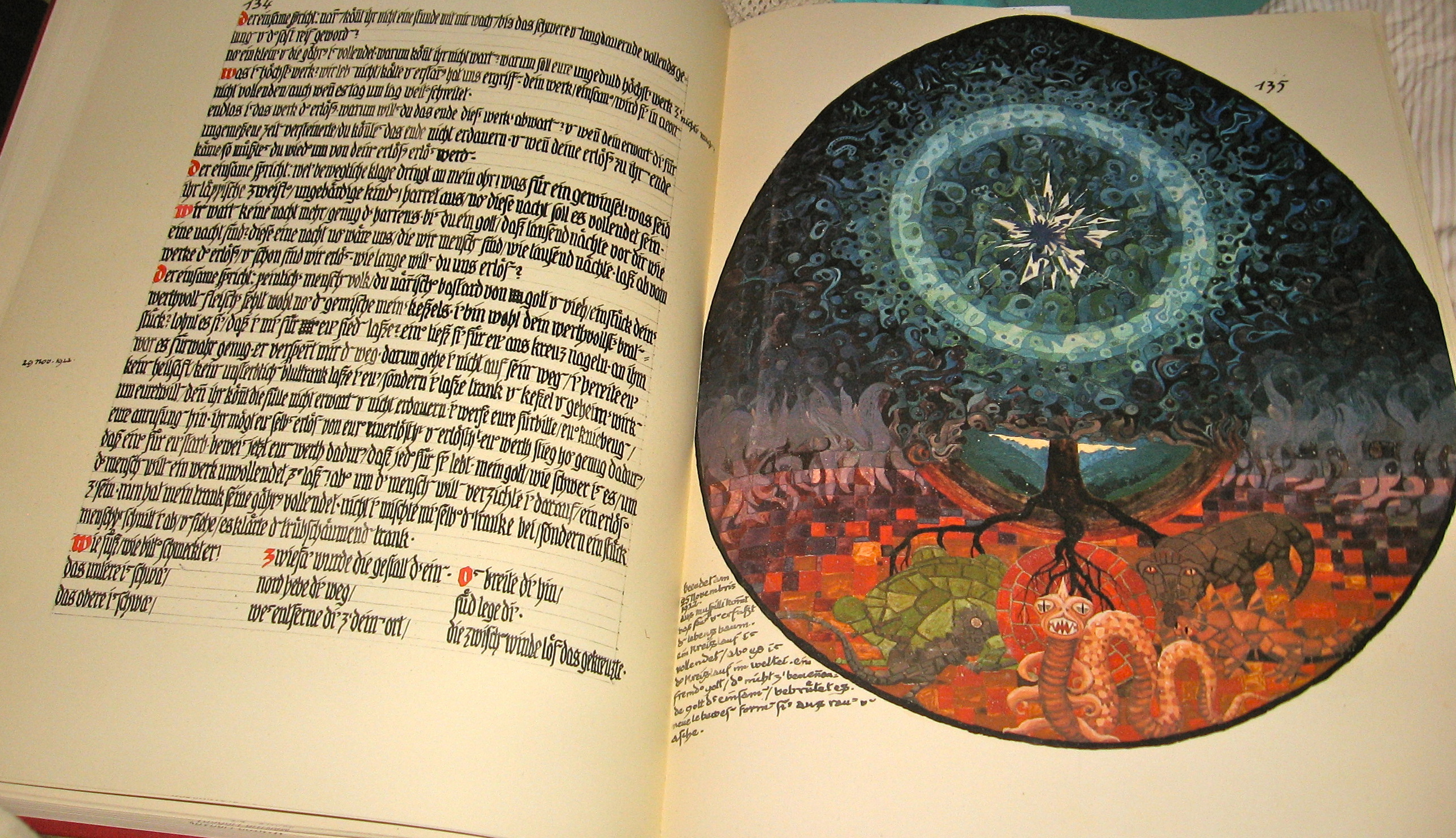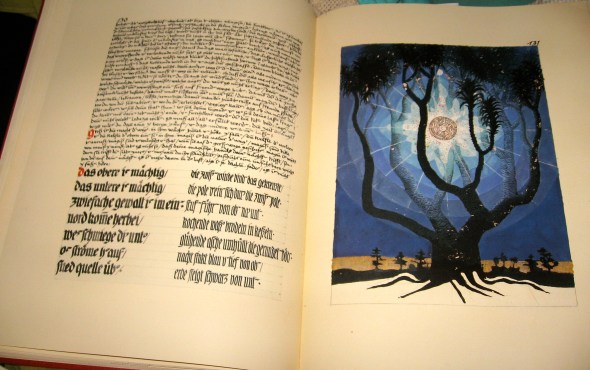 The book itself is oversized, must weigh 5 lbs and is not by any means a quick, light read!  It is however a beautifully rendered account of his quest for insight, both visually and through text. Sonu Shamdasani, Mark Kyburz and John Peck provide notes and translation.  The below photos are from this 2009, Foundation of the Works of C.G. Jung text.