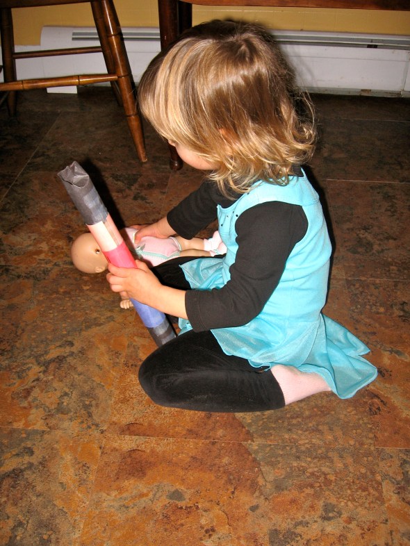 Posted: December 13, 2011 Filed under: Child Centered Activities 5 CommentsIt’s all drama at our house, and I mean the good kind! David took our daughter to the Nutcracker a few weeks ago and all she wants to do is role play the characters. She eats and sleeps in a ballet costume and if Tchaikovsky isn’t playing thru the speakers, she’s humming her version of it. E has been asking for a Nutcracker of her own and here is our quick DIY version. I just covered a couple paper towel tubes with strips of colored construction paper. Clear tape and sharpie finished the job with just enough details to identify the characters.