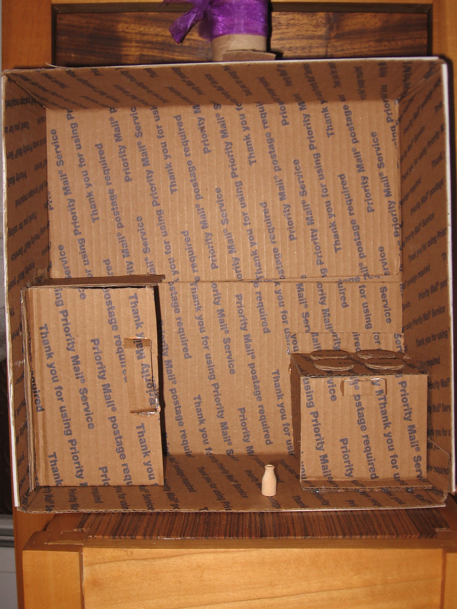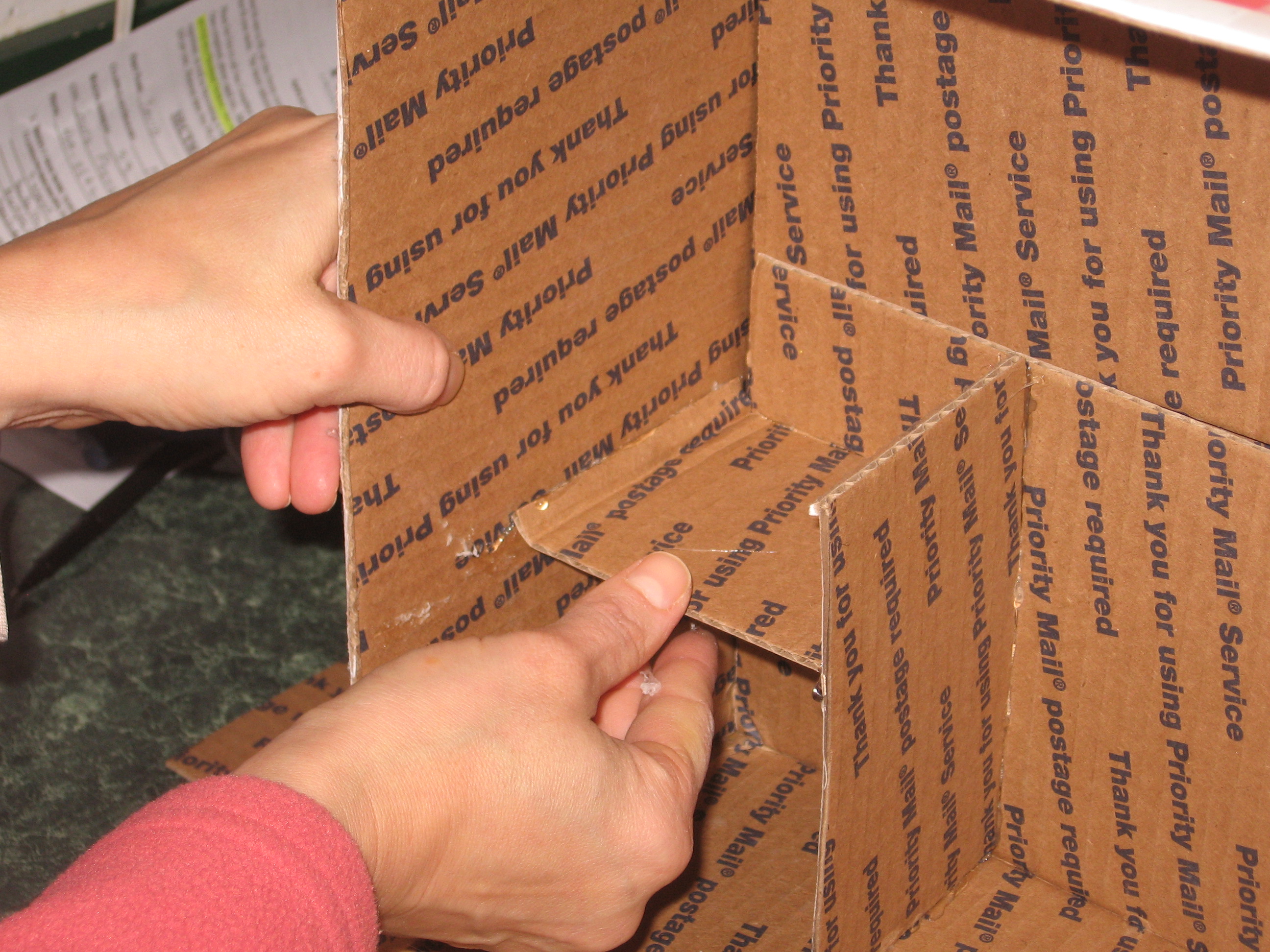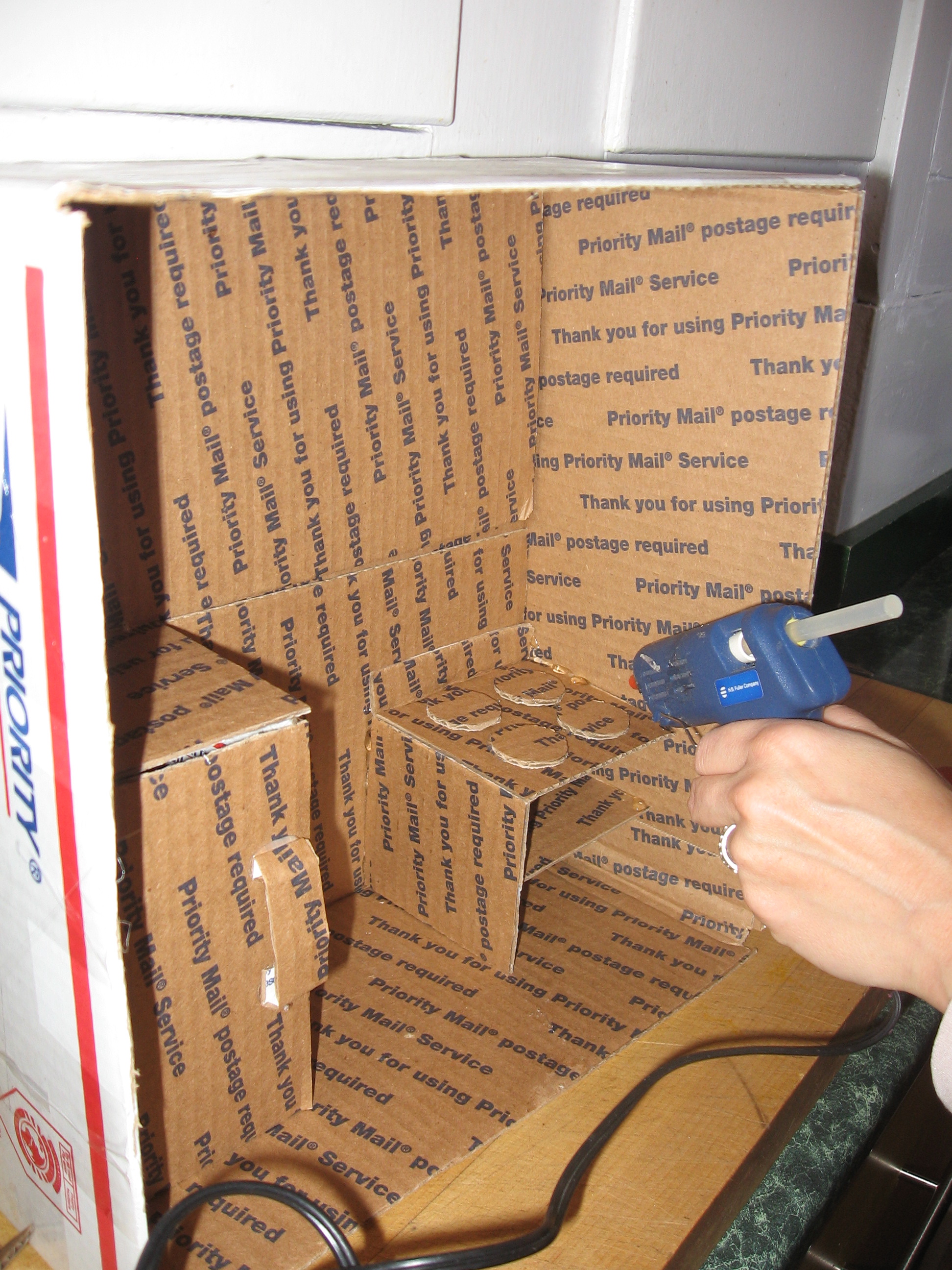 We pulled out some cardboard scraps, hot glue gun and went to work. I did the cutting and gluing while she stayed close and watched.