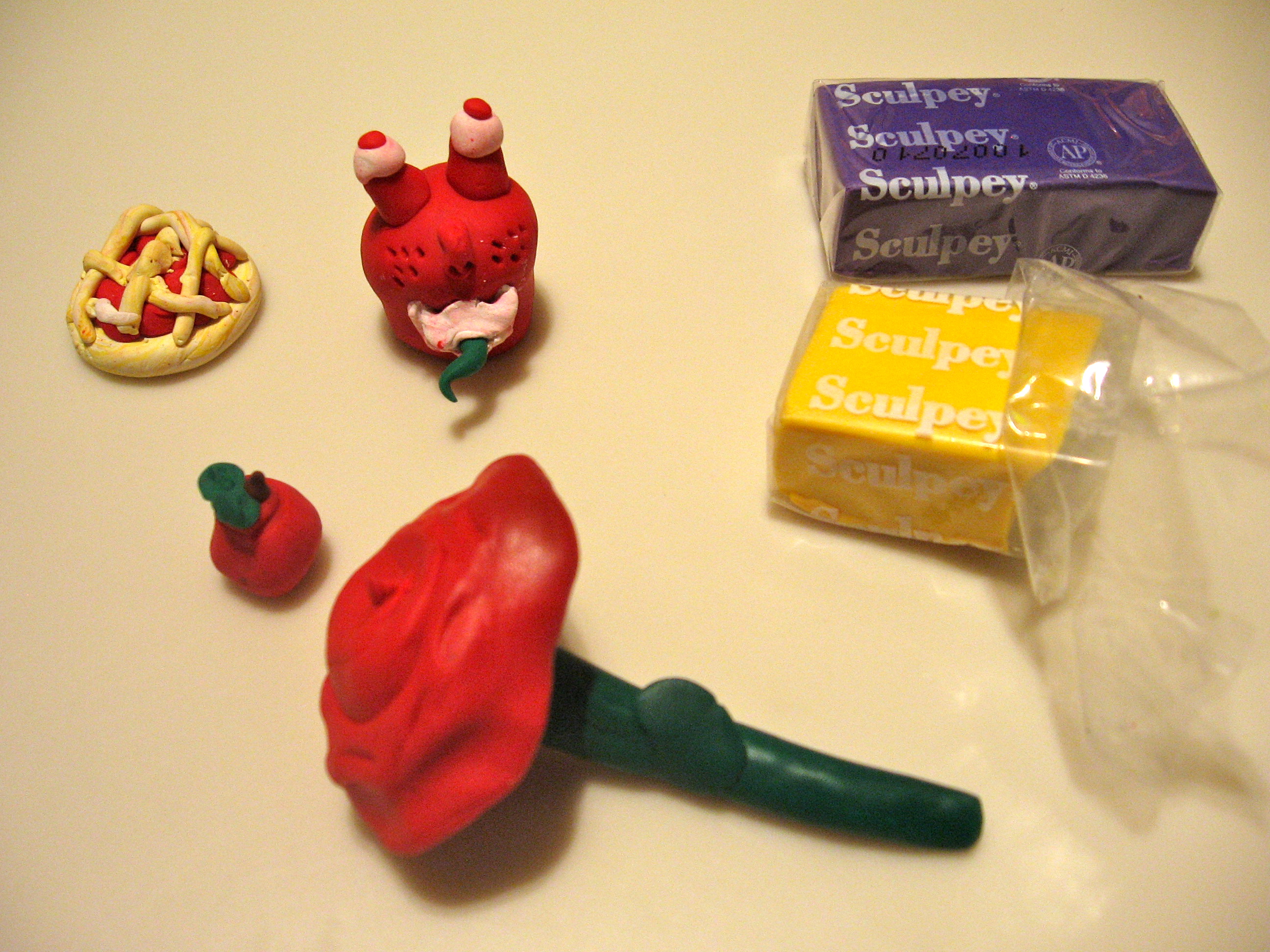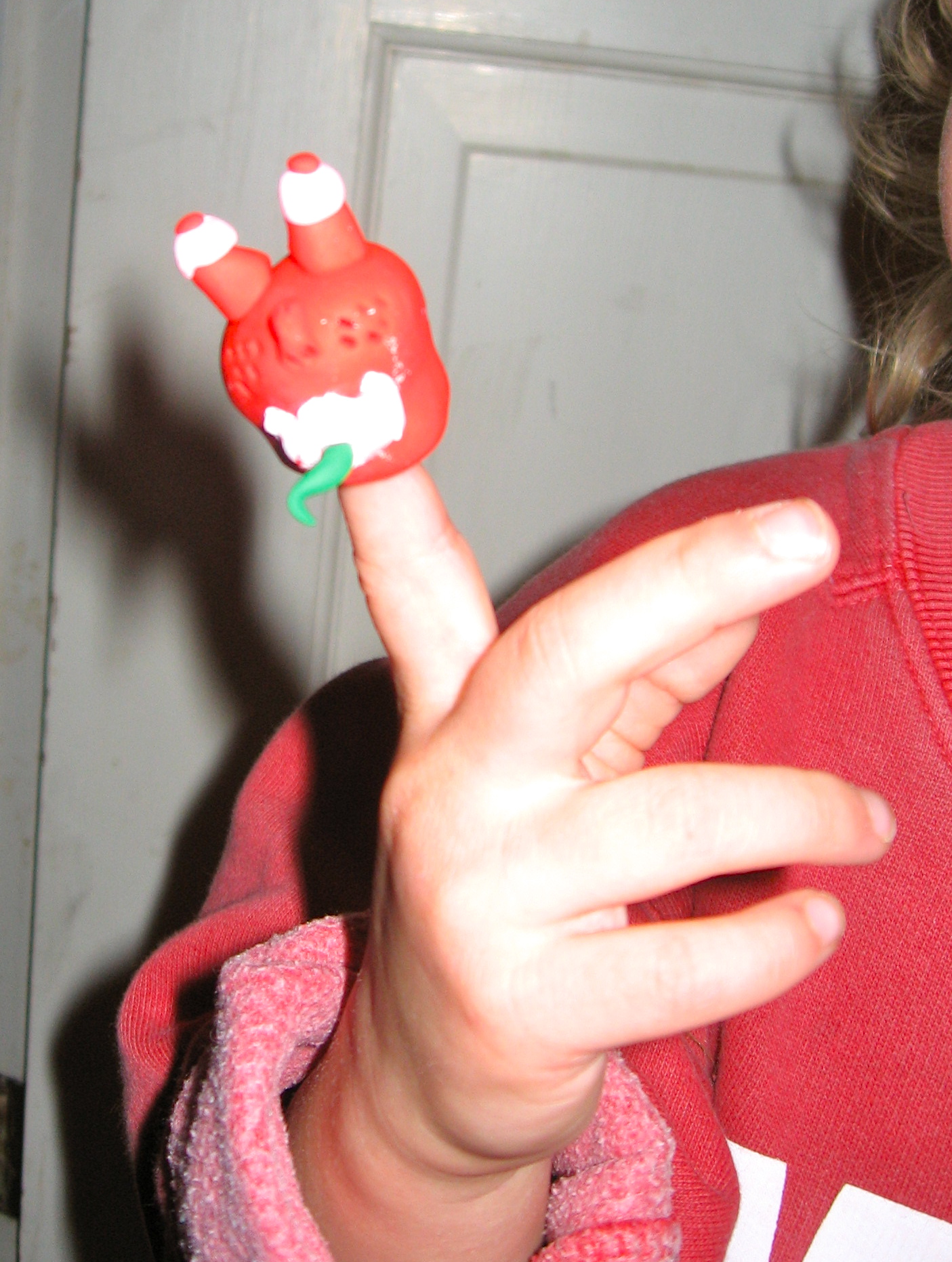 We spent the holidays with E’s cousins (beautiful, smart girls aged 9 and 11) who were up visiting from Florida.  We gave them some Sculpey Clay for Chistmas and they created some fun objects for E to play with.The great thing about Sculpey is its availability, relatively low price, broad range of colors, and ease of baking at home (make sure you follow directions closely).