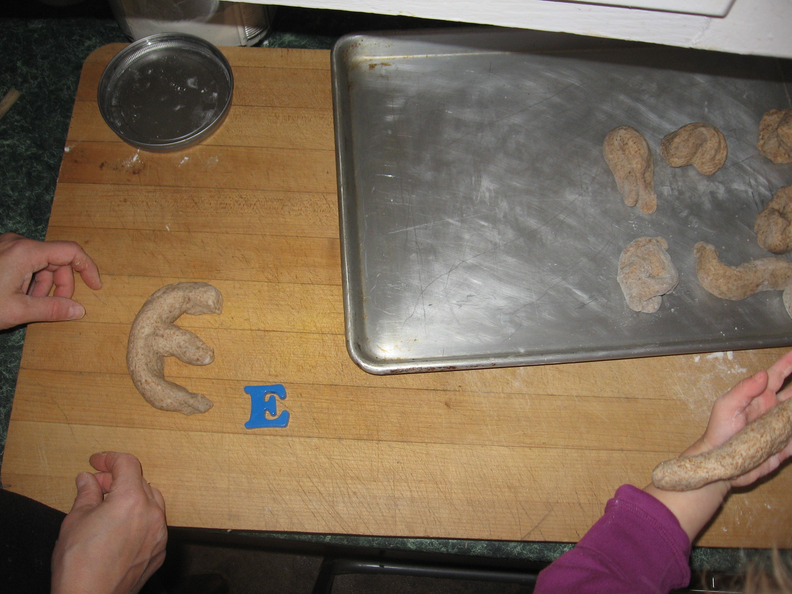 Preheat oven to 400. Throw out bit of flour on work surface to minimize sticking. Break off golf-ball size pieces of dough and roll, smoosh, twist, work into letters, whatever works!
