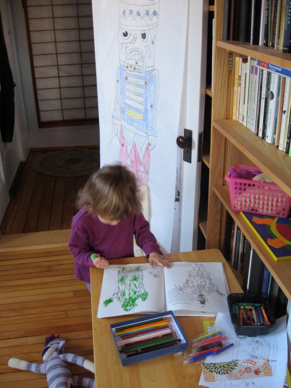 Working in her Nutcracker coloring book from Gramma Jane. Beautifully detailed depiction of all the characters.  The music is playing in the background.