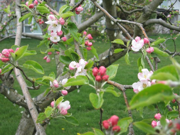 Posted: May 9, 2012 Filed under: Art & Healing, Gallery - Visual 2 CommentsHere in zone 6, on the ocean, there have been two weeks of cool, damp days. The trees and shrubs are happy, with buds ready to burst. This is the magic time, and with a day or two of sunshine, the apple orchard will be resplendent!