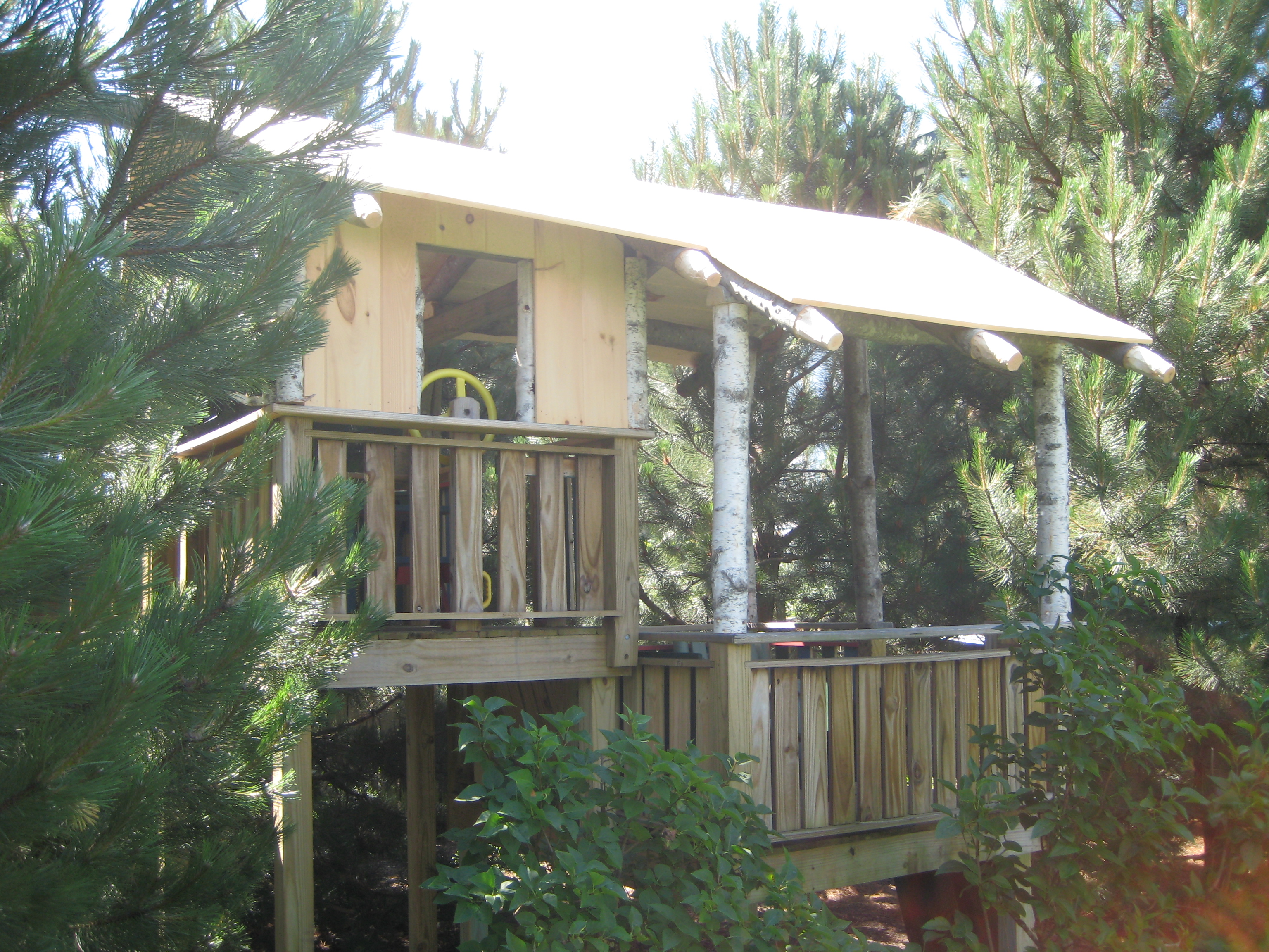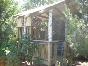 Something told me not to anchor the fort into the apple tree, and that premonition proved true a year later – last year – when we were told to move the fort to a different location. Down came the pieces (and the tree remains pristine) and the platforms were reassembled, this time surrounded by Austrian Pine trees. We added a crow’s nest, tucked high back among the pines.