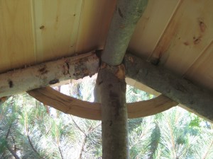 But even that was not quite right. As children love a spot to hide in, we wanted to add a roof, and enclose the second level. Dimensioned lumber – your basic 4x4s or 2x4s – would not be right so off we went into the woods looking for beech and birch trees, to limb and cut down and use for the ridgepole, rafters and beams. We “beavered” the rafters and notched the cross beams. We used some pine boards for the walls and roof.