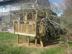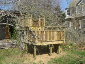 Posted: July 5, 2012 Filed under: Child Centered Activities 5 CommentsA couple years ago, at my day job, we built a tree fort. A furnituremaker helped, and the joinery made this something special; we cantilevered two platforms within an apple tree and it was quite beautiful, wrapped in blossoms during the spring flowering, hidden by leaves throughout the summer, ripe red fruit easily grabbed come autumn.