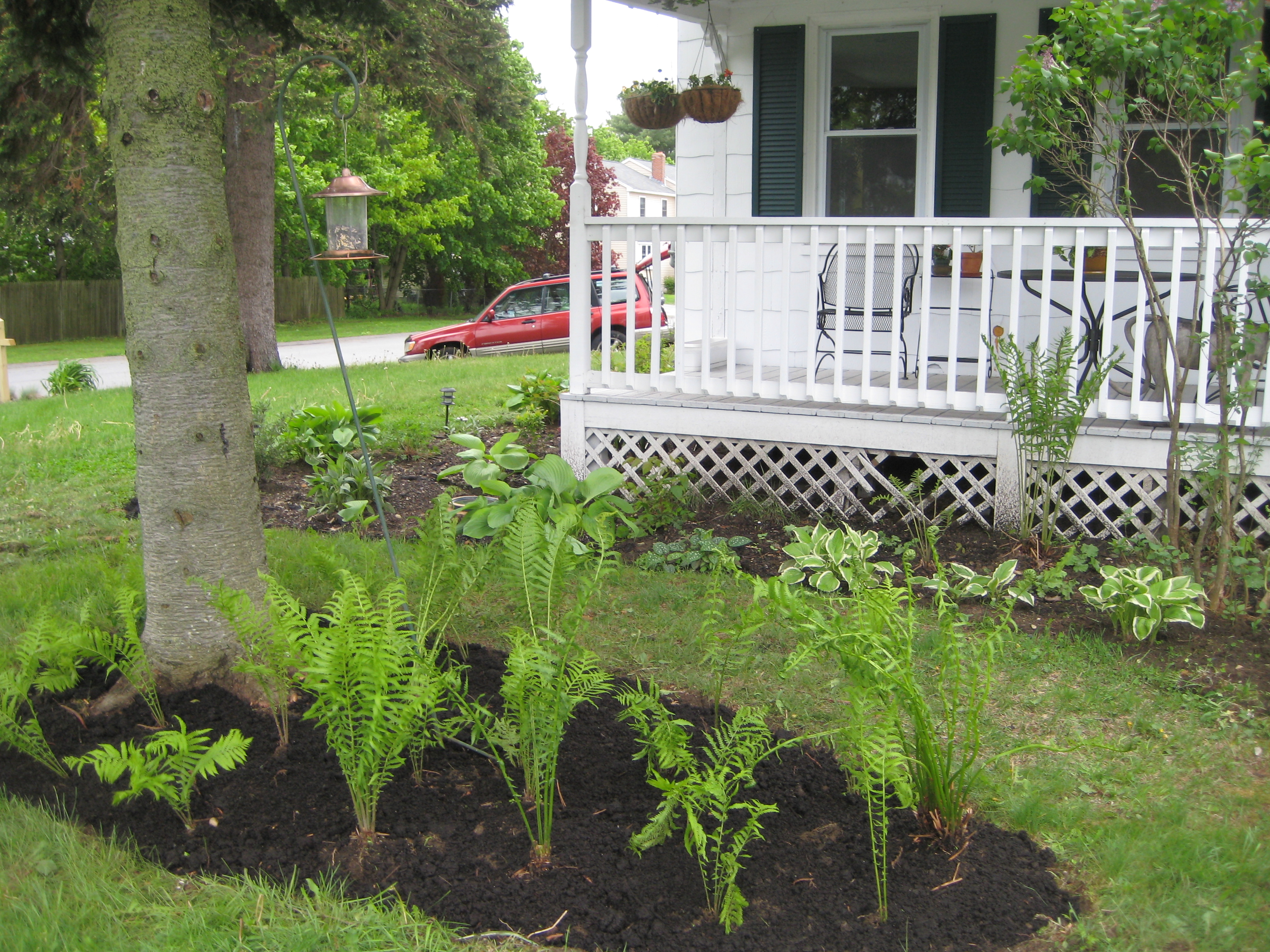 From a thicket of lilacs, dogwoods, spirea, and one still-unidentified shrub – truly the ugliest hedge anyone had seen, and no one could solve – I partially removed shrubs along a 20-foot section. Transplanted to our house this became the backdrop for our entire foundation beds, plus a privacy hedge along the street where our chicken coop will go.