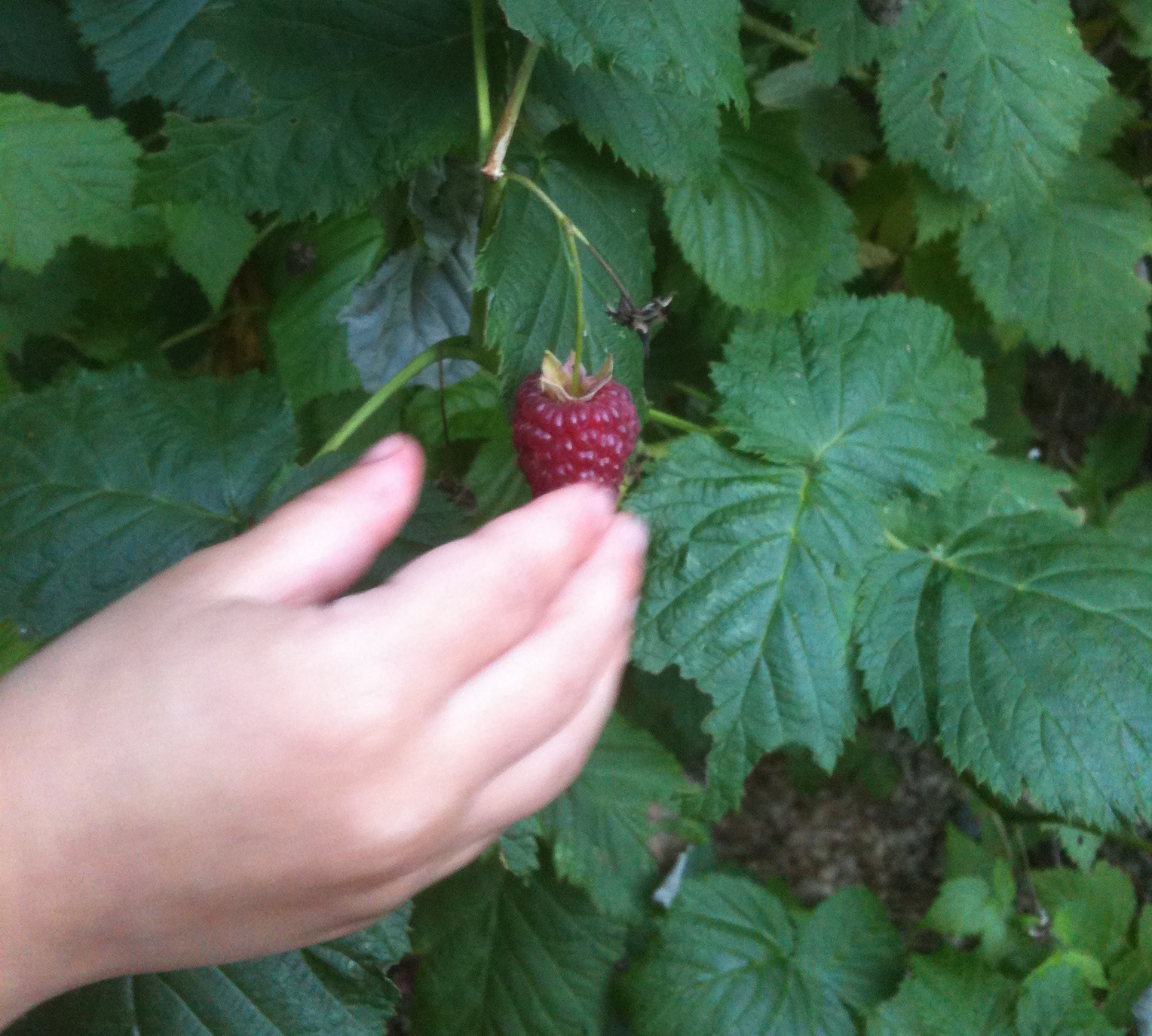 Posted: August 6, 2013 Filed under: Child Centered Activities, Farming off the Farm, In the Kitchen, Permaculture & Home Renovation 3 CommentsLast night, as we prepared to eat dinner on the porch, our neighbor Steve came walking down the magical path to our house. He told us that there was at least one quart of red raspberries waiting to be picked on the canes growing behind his house. That was a call to arms!