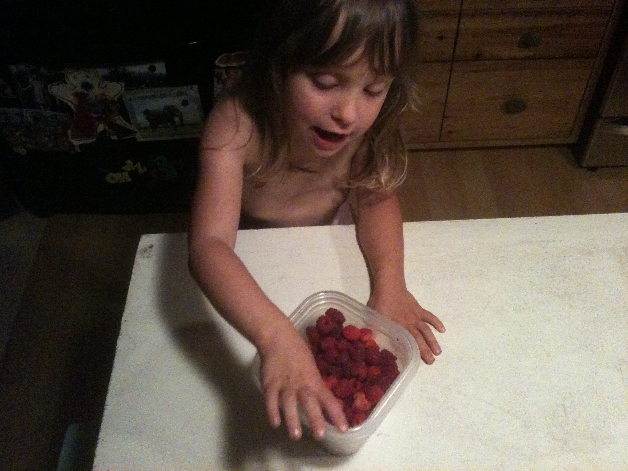 Our four-year old daughter E loves picking berries, and so this offer was the equivalent of Halloween and Christmas combined, in August. We quickly finished our dinner and then E and I ran down the path to Steve’s house.