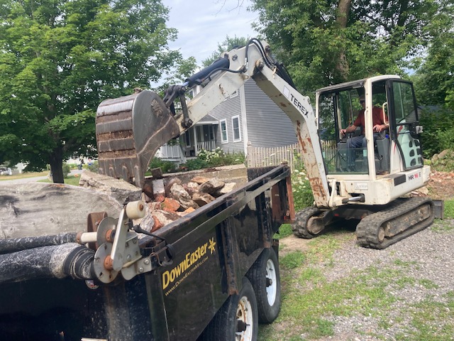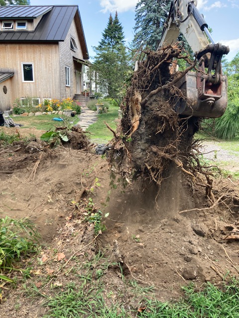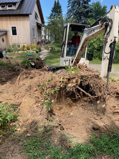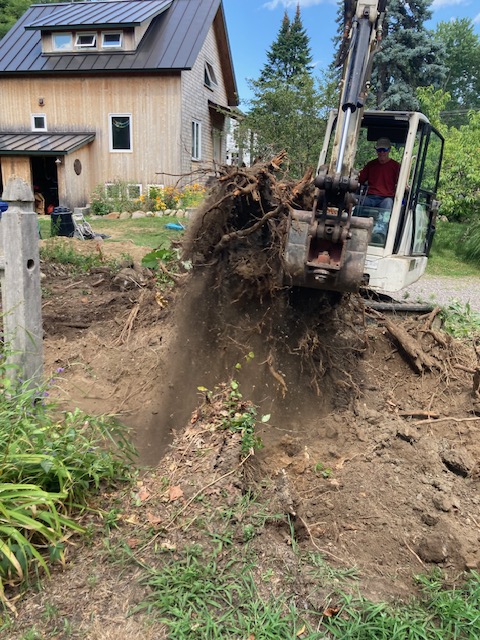 Time now is of the essence, and given the heavy equipment this is a mere trifle. Jim has arrived and we have removed 9 cubic yards of rubble, 3 cubic yards of tree stumps. We will remove approximately 15 tons of soil, and then move the gravel into that space.