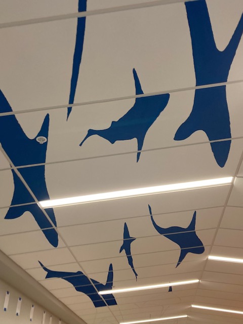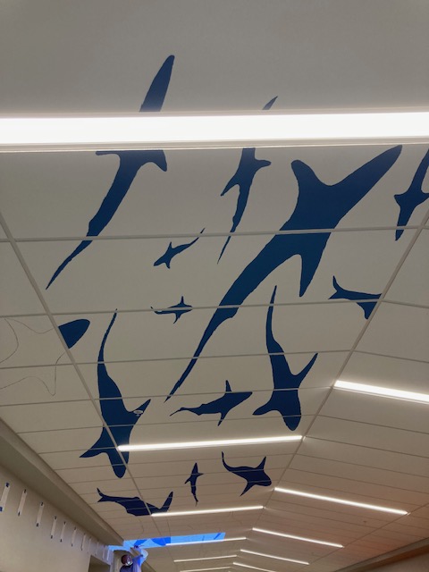Posted: August 16, 2024 Filed under: Child Centered Activities, Gallery - Visual, Portfolio - David's work | Tags: ceiling mural, one percent for art, sharks 1 CommentOne year ago, summer of 2023, I worked on painting a ceiling mural at the new South Portland Middle School. Chris Miller, a polymath maker, very good friend and father of two young boys had received a commission and needed help. I gladly answered the call.