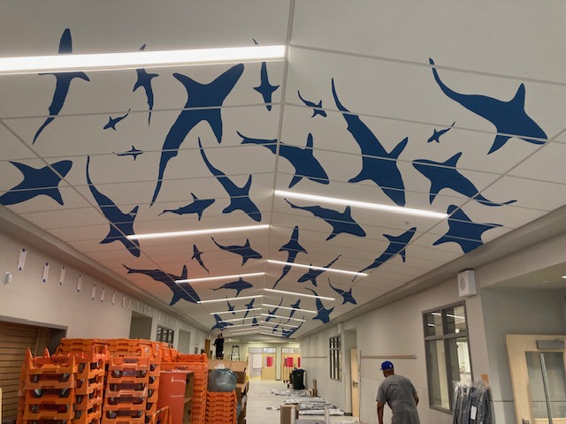His design originally called for a pod of humpback whales in silhouette painted on the ceiling of the school’s central corridor. The Principal held a vote and the students selected “Sharks” as the new school’s mascot, and so a last minute change was called for. Chris complied and the whales became sharks, swimming overhead. http://npdworkshop.com/pod-cosmos
