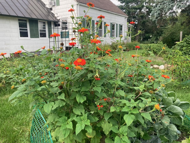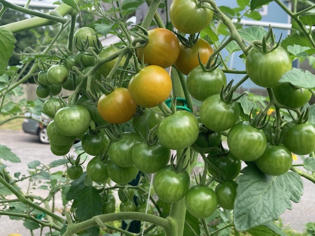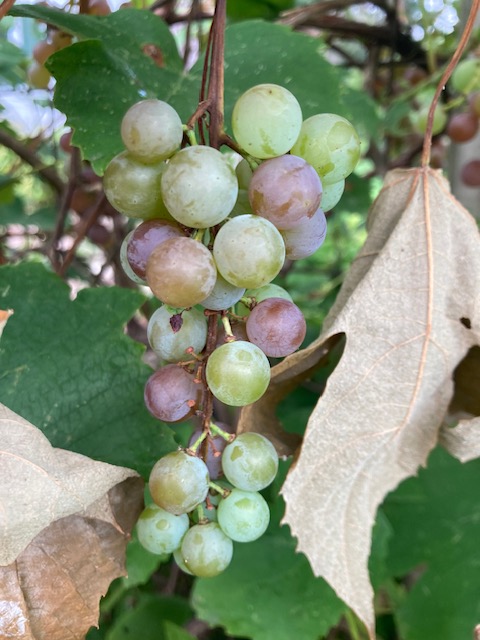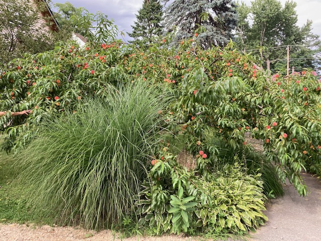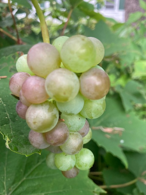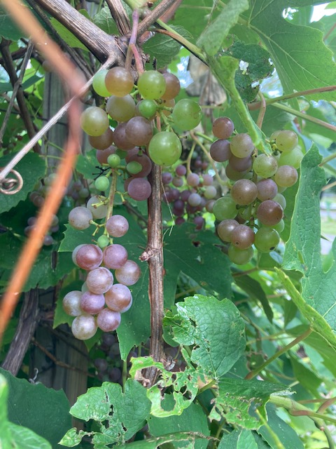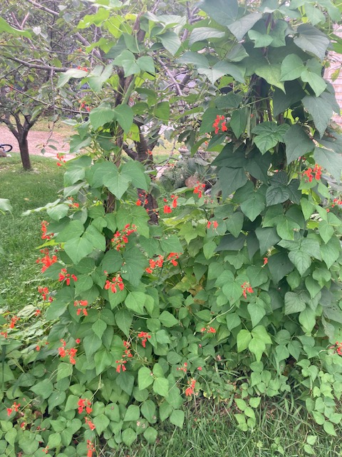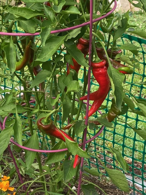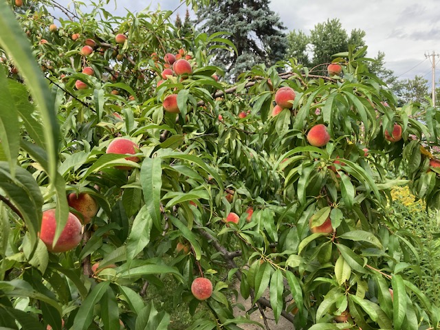 Here at an art farm Bacchus has arrived bearing wild seedless Champagne grapes. Jimmy Nardello Italian Frying Peppers are abundant. Tomatoes exceed our capacity to use. Pole beans flower, to attract hummingbirds. Butternut squash grow on the vine. Peaches are ripe for the picking. We bring bushels of produce to the Food Cupboard.