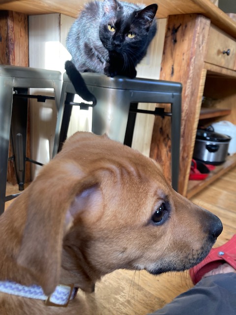 We drove to Acton last Friday ostensibly “to look” at a puppy. But no one drives one hour one-way just “to look” so it was no surprise that we returned home with a 9-week old female puppy, recently arrived from Webster Parish in northwest Louisiana. The Mother was a lab-mix while the Father is unknown. She appears to have some Rhodesian Ridgeback in her.