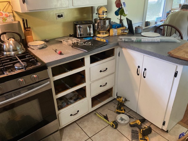 Arguably the cabinet repair’s cost – at 6 feet in length – was upwards of $6,000; I could have stood firm that the entire cabinet needed replacement.  But I admired my Client’s frugality, which reminded me of the home where I grew up, built with cabinets of chip board and 1/2” plywood door and drawer faces; 1960-built cabinets that served seven people for 63 years.  As any New England Quaker well knows, simplicity, frugality and common sense are principles to live by.  So I agreed to solve the problem, rather than demolish and rebuild.