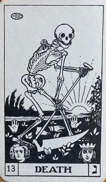 Many cards had been lain on the table.  As we cleaned up, the last card picked up was #13 Death.  Again, synchronous, the Master commented, “You are all going through a transition.”