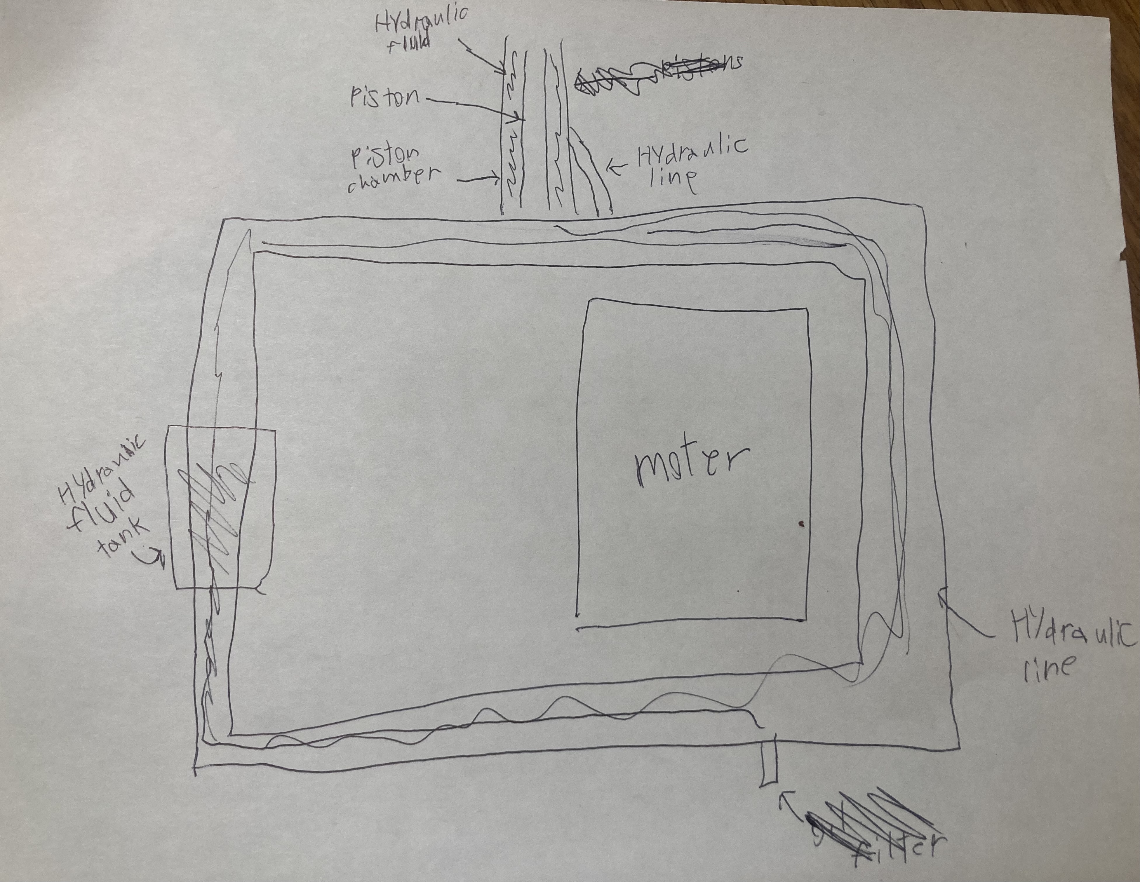 To explain how the hydraulics work my son drew a diagram then described the hydraulics like this: “It is like a big rectangle. When you turn the motor on, the hydraulic fluid moves through the lines…around the edge of the rectangle, and then it goes into the piston chamber with a diameter about 5”. As you open the lever, the fluid fills the chamber, where the piston is centered, and the piston begins to move forward, in the path of least resistance. When you toggle the switch back, the piston retreats. It is something like that.”