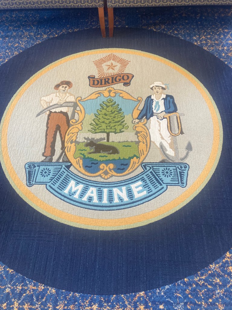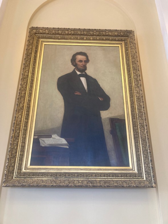 A painting of Abe Lincoln towers over the chambers, and quite a story lies behind that painting. In 1819, Maine was the northern district of Massachusetts and petitioned for statehood. But the slave states refused to allow a free state – one not allowing human enslavement – to enter the union. A deal was made.