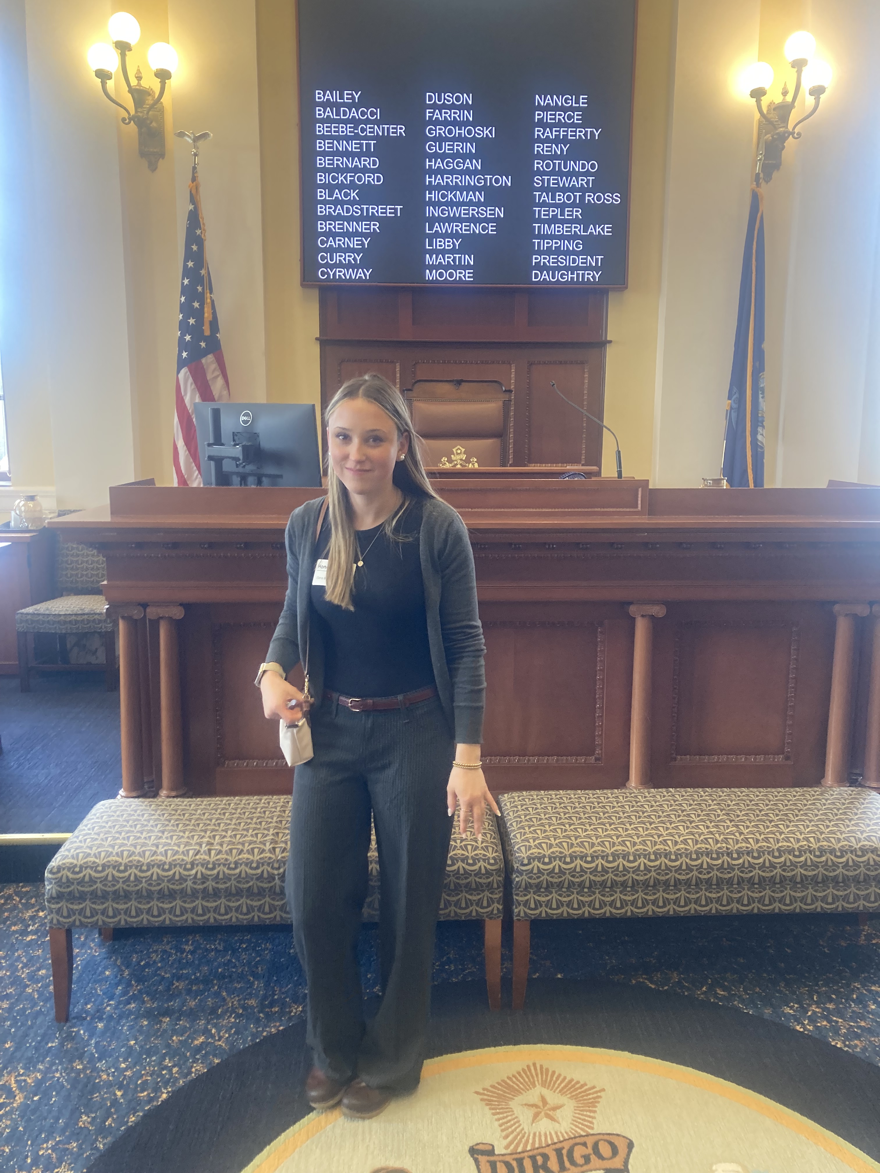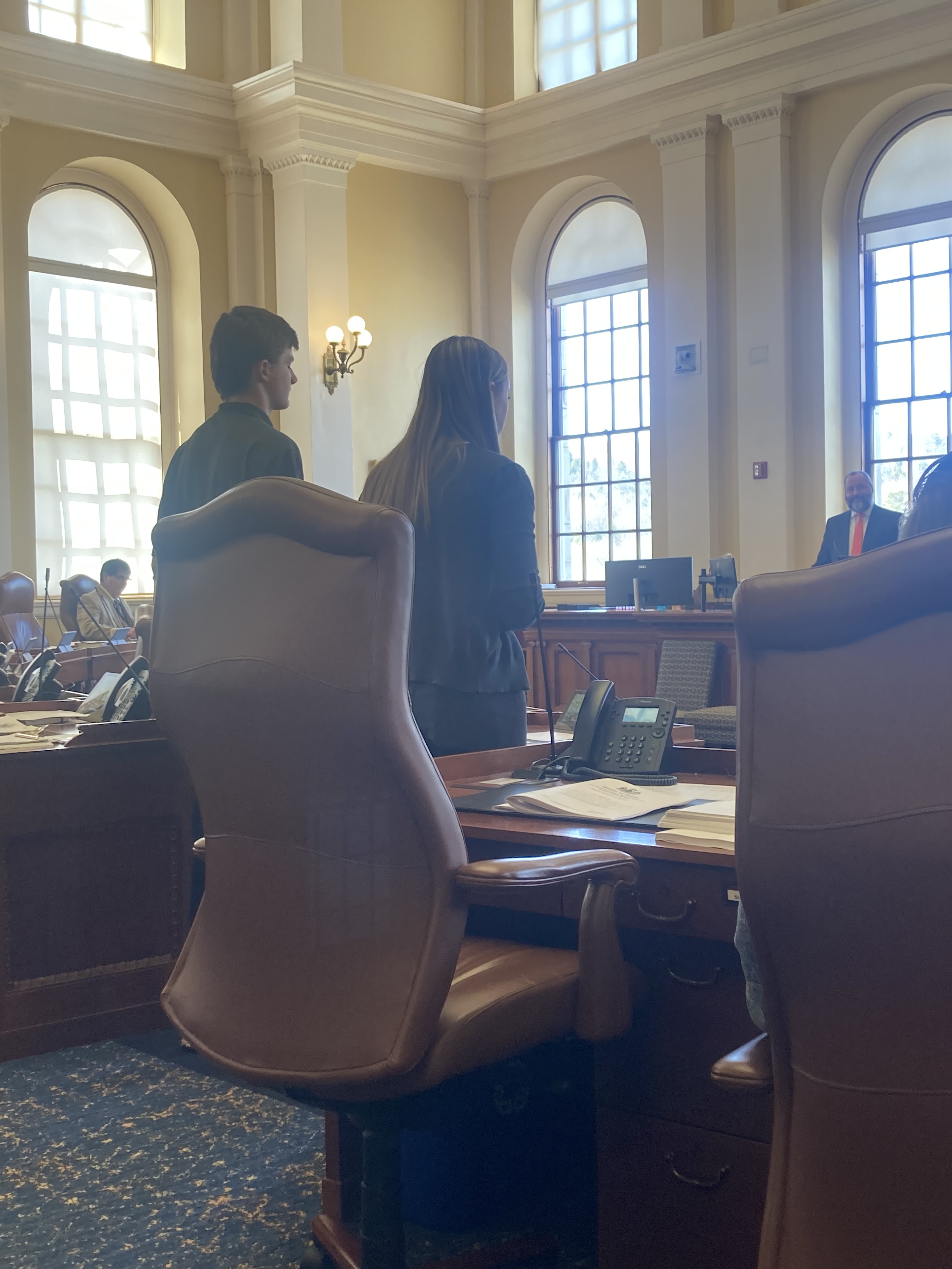 Anne Carney – Senator for our South Portland District – chose my daughter because of her academic performance. The dress code was “business casual” which my daughter nailed, in a style all her own. I wore not the Carhartts of my day labor, but “family of origin” clothes: dress slacks, collared shirt, belt and a blazer. But no tie.