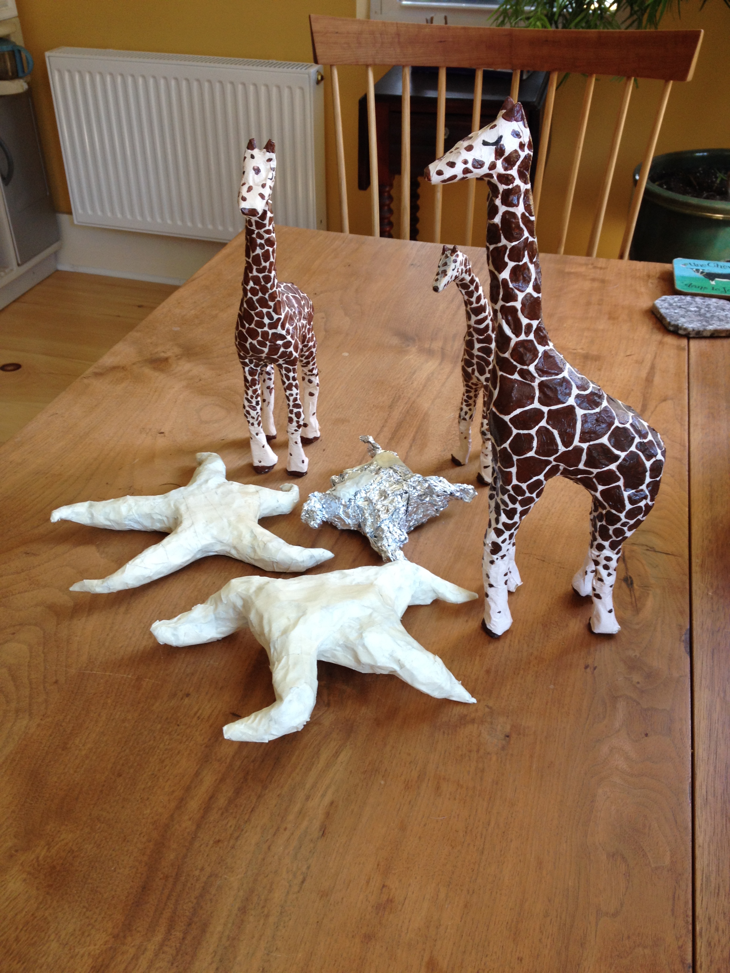 Posted: July 17, 2015 Filed under: Art & Healing 3 CommentsThe giraffes have long awaited the next members to the foil/tape sculpture family.