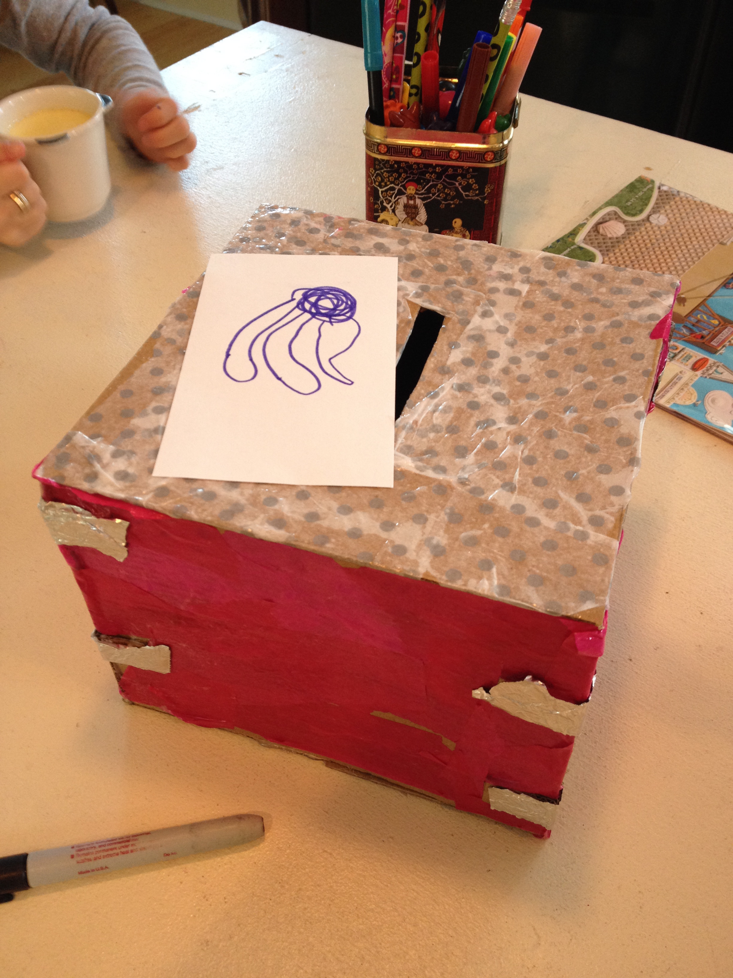 Elena decorated the outside of the box with tissue papers and aluminum foil. While the glue dried, she furiously worked on index cards drawing symbols and letters to record her thoughts.