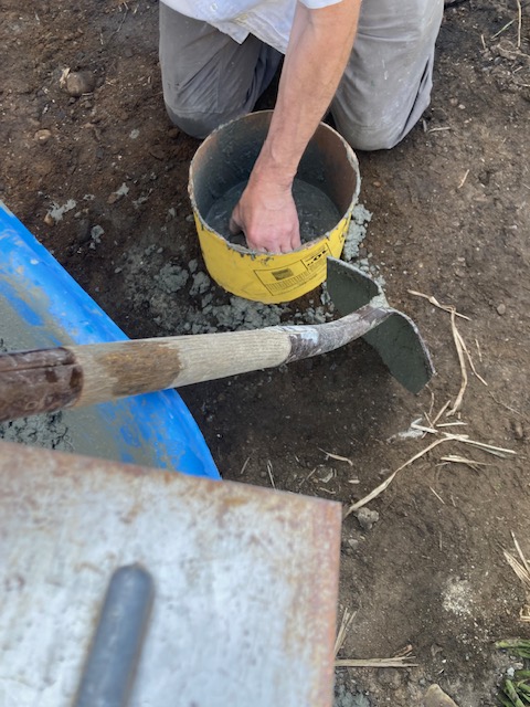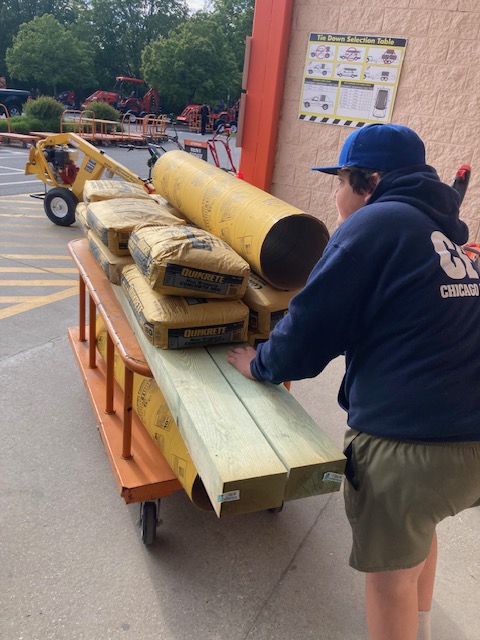 About that volume, my son correctly calculated that each column was 2.8 cubic feet, which required 480 pounds of concrete. A heavy load, I was thankful for a young assistant.