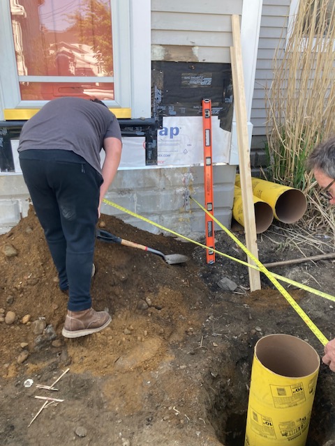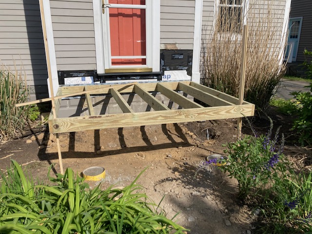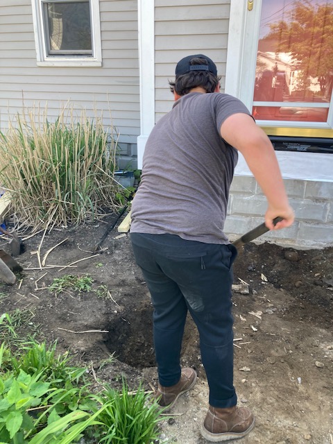 The new entry will have a platform about 4’ high, with four steps to it. This is applied geometry and we discussed the area of a rectangle [width x length], the area of a triangle [1/2(width x length)] and the volume of a column [V=π r2 * h]. We needed to calculate the volume to know how much concrete to buy. To place the footings, we located two points at right angles and parallel to the house. Pythagorus solved that question. We used the 3,4,5 triangle; given a2 + b2 = c2 then 9 + 16 = 25 marked the exact locations where we would dig.