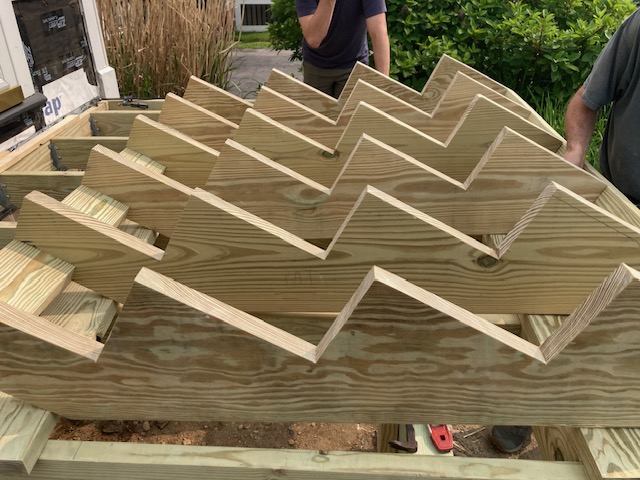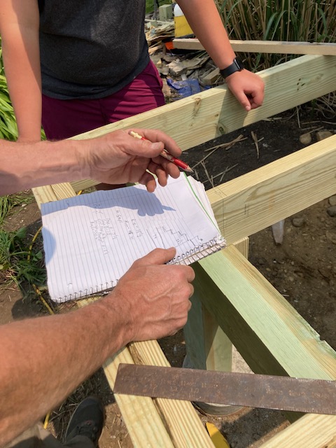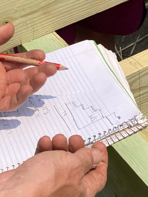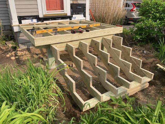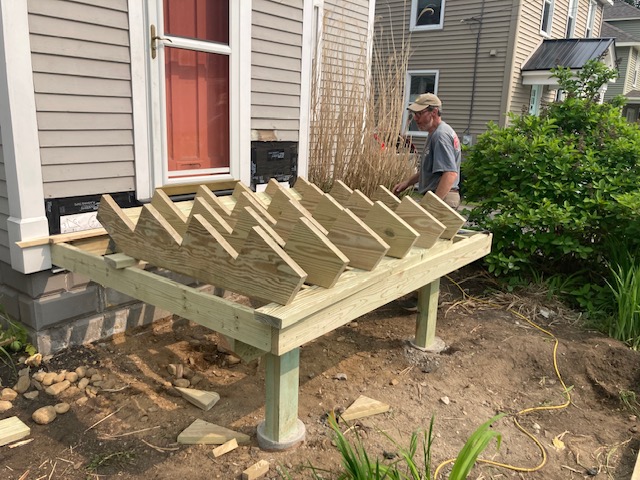Our project’s head carpenter is a journeyman Master Carpenter, who has built homes on the islands of Maine for decades. Building on an island requires the ultimate resourcefulness; everything used is carried by boat to the job site and so waste is minimal. A calm and wise teacher, he explained use of a sight level, how to square the platform, how to measure and cut stair risers. The platform he built is remarkably strong and the client is pleased. My son hopes to handle the landscaping that follows.