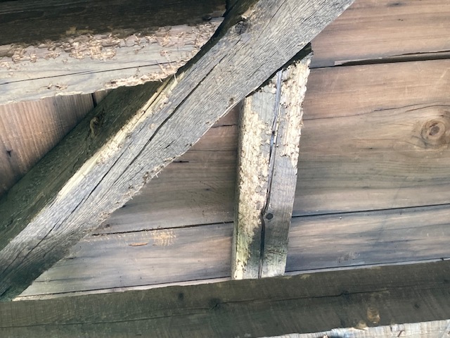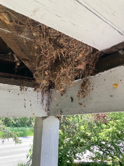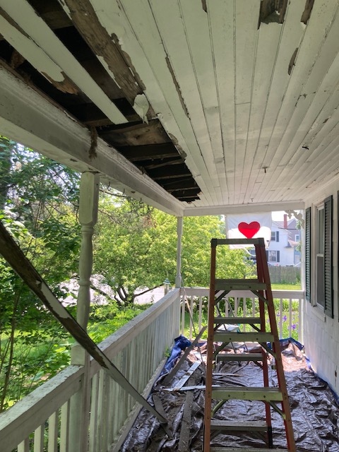 The job was messy. Our puppy stayed inside while I laid out a tarp to catch the debris and the paint chips, which most likely were lead paint. I wore a mask and detritus rained down upon me. Animals have been living in that space for many years. Decades ago, word must have gotten around the town. Pre-covid, House Sparrows made their home there. It was awful. There in the corner cowered a raccoon. I stayed clear, and continued removing other boards. I needed to open up the entire front section of the porch ceiling.