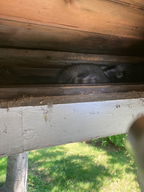 I reached out to an animal rescue service, and the news became bad. Raccoons carry several parasites, including roundworm. A cornered mother can be vicious. No one was available to come trap and remove them, so the plan was to let them make their exit on their own time. Eventually the kits scurried about on the beams overhead. While their Mother went off in search of a new home, our puppy could hear the kits crying on the porch and stirred up great havoc, inside our house. Our puppy’s true nature was on full display. She could not be let out into the yard.
