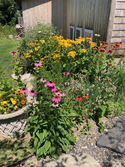 Growing up, the Midwestern mantra was corn “knee high by the 4th of July.” In Zone 5 coastal Maine, the snap peas tower at 5′ tall, tomatoes ripen, cucumbers flower while the grapes fatten; raspberries and cherries – radiant red – hang for the picking, while the coneflower and echinacea proudly display their Fibonacci ways.