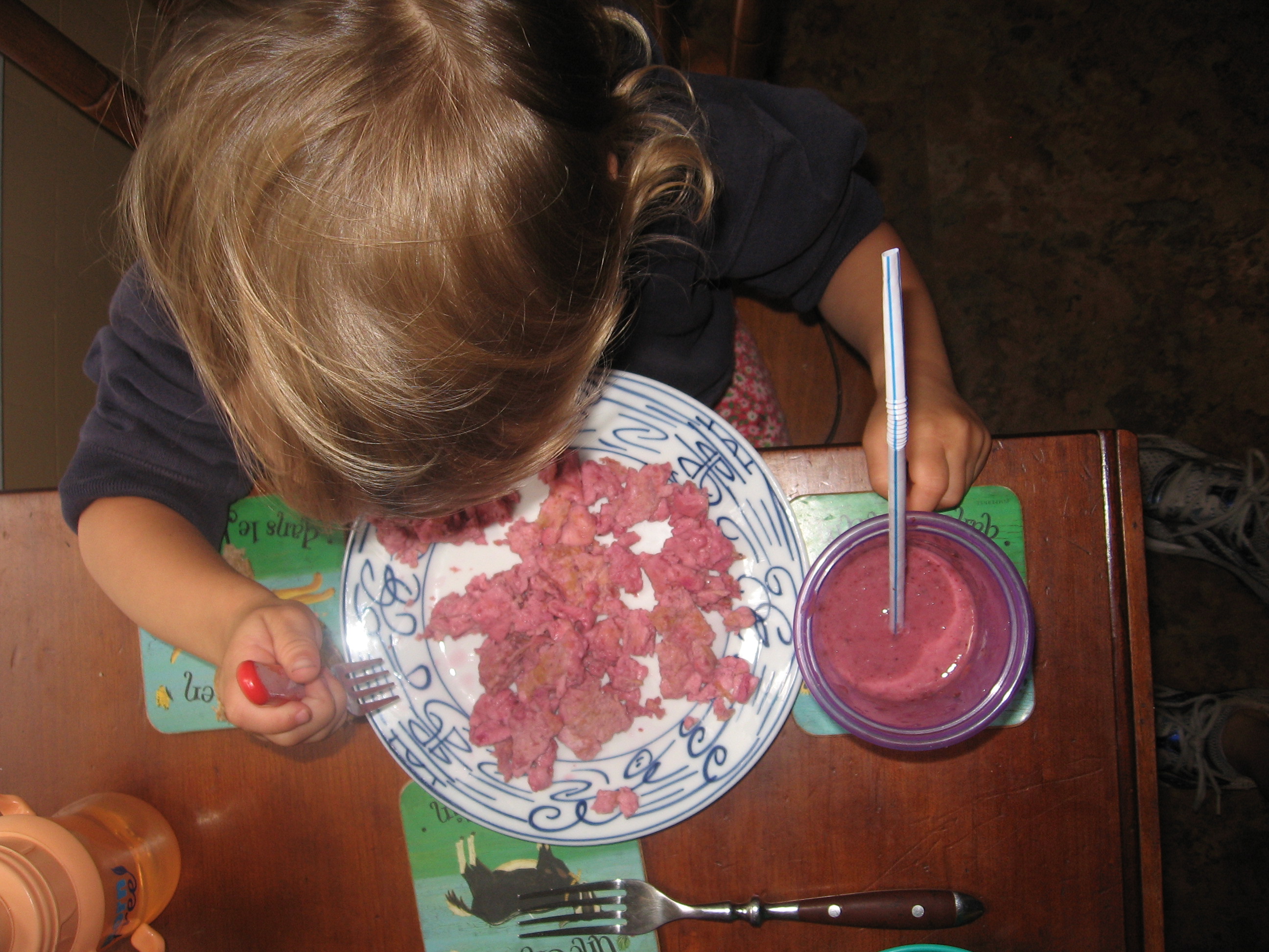 Posted: August 26, 2011 Filed under: Chronicles of a First Time Parent, In the Kitchen Leave a commentMy poor kid, we’re still finding uses for the leftover beet puree! Nothing like a monochromatic meal of purple eggs (once she saw it she asked for green eggs and ham) and smoothie!