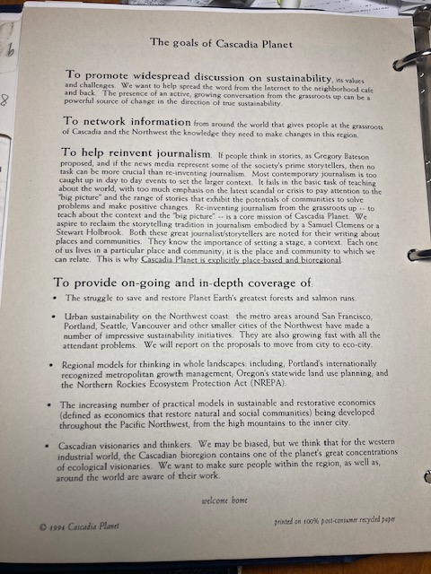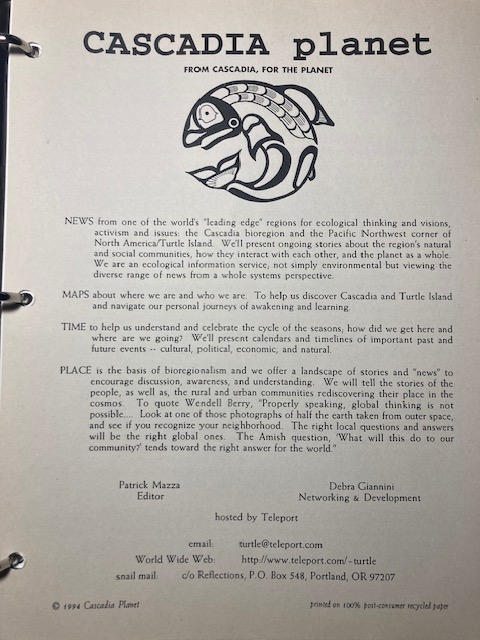 There were stories to tell. I raised funds for a video documentary series, in newsmagazine format, profiling the bioregional movement. I met with Patrick Mazza, a journalist, and we developed plans for “Cascadia Planet” a website to include “text, multimedia sound, images, graphs, lists and a web-structure for related Internet searches.” Bear in mind, 1993 was an internet before video, before streaming, fewer than 600 web sites in total, before iPhones or social media apps; Mosaic had just been released and was the first browser to show both texts and images on the same page, a key factor in early acceptance of the World Wide Web. The air was electric with possibility.