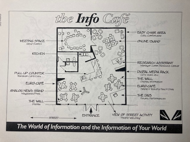 Powell’s Books Chicago is an independent used bookstore, launched in 1970 to serve the intellectual and general interest community in the Hyde Park neighborhood. Michael Powell, the owner’s father, became intrigued with the store and launched, in 1971, his own used bookstore, “Powell’s City of Books” in Portland, Oregon. At 68,000 square feet – about 1.6 acres – of retail space the flagship store is the largest used bookstore in the world, with reading rooms where people are encouraged to sit and linger. It seemed a model for my Info Cafe.