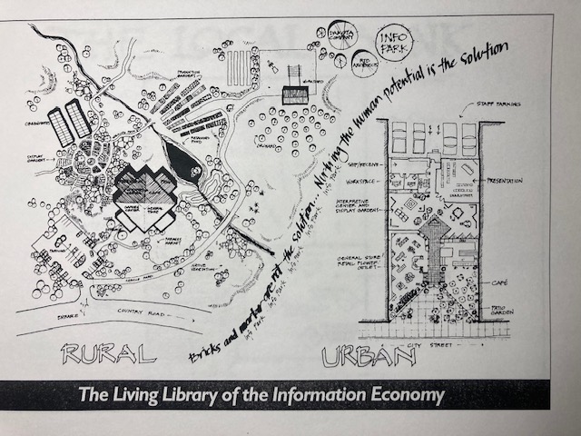 In addition to planning the world’s digital library, I organized a bio-regional news service and drew blue prints for community-based retail outlets. To my mind, the information future could not only be virtual, but need be tethered to life on the planet. I adapted Aristotle’s definition of man as a “political animal” using the tag line “Regardless of the internet’s reach, we will always communicate face-to-face with our neighbors.” I travelled to Vienna, Austria to attend an eco-cities conference, on how to rebuild our human habitat in balance with living systems.