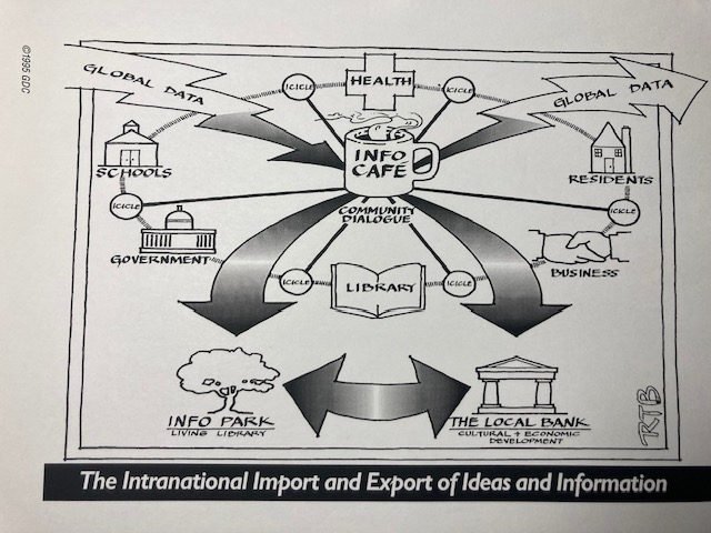Taken collectively, this was called “Global Data” – the world’s digital library plus a bioregional news network plus local grass-roots community dialogue: “The Intranational Import and Export of Ideas and Information.” Global access to information grounded face-to-face, person-to-person in dialogue with your neighbor, to solve problems, to build a sustainable future. Locavore, indeed.