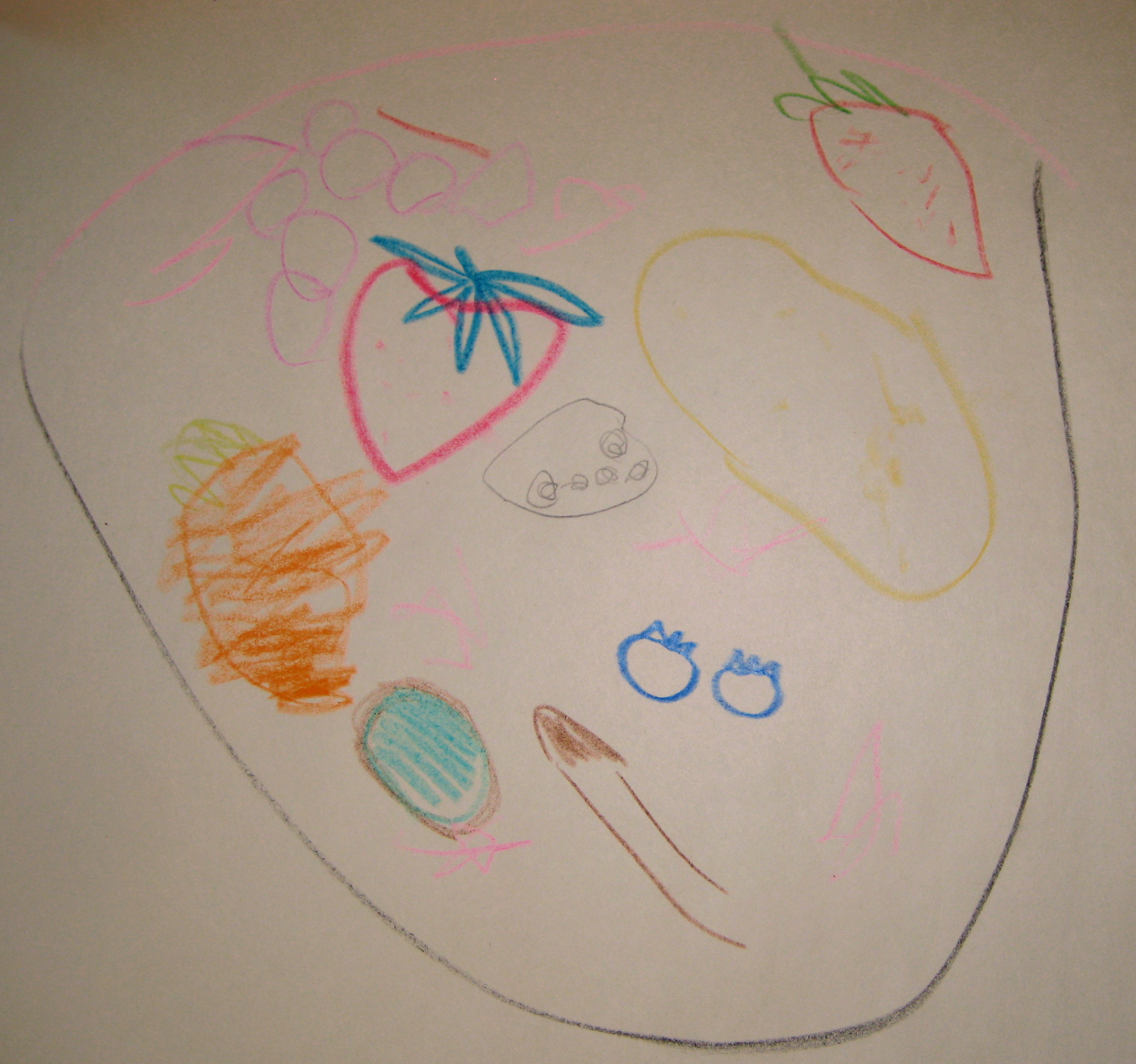 Next we made a picture of what could help us get better. She suggested a “rainbow salad”. Below is her bowl full of fruits we drew together. Overall, a nice distraction and opportunity to connect with what is happening in her body and how she can help herself!