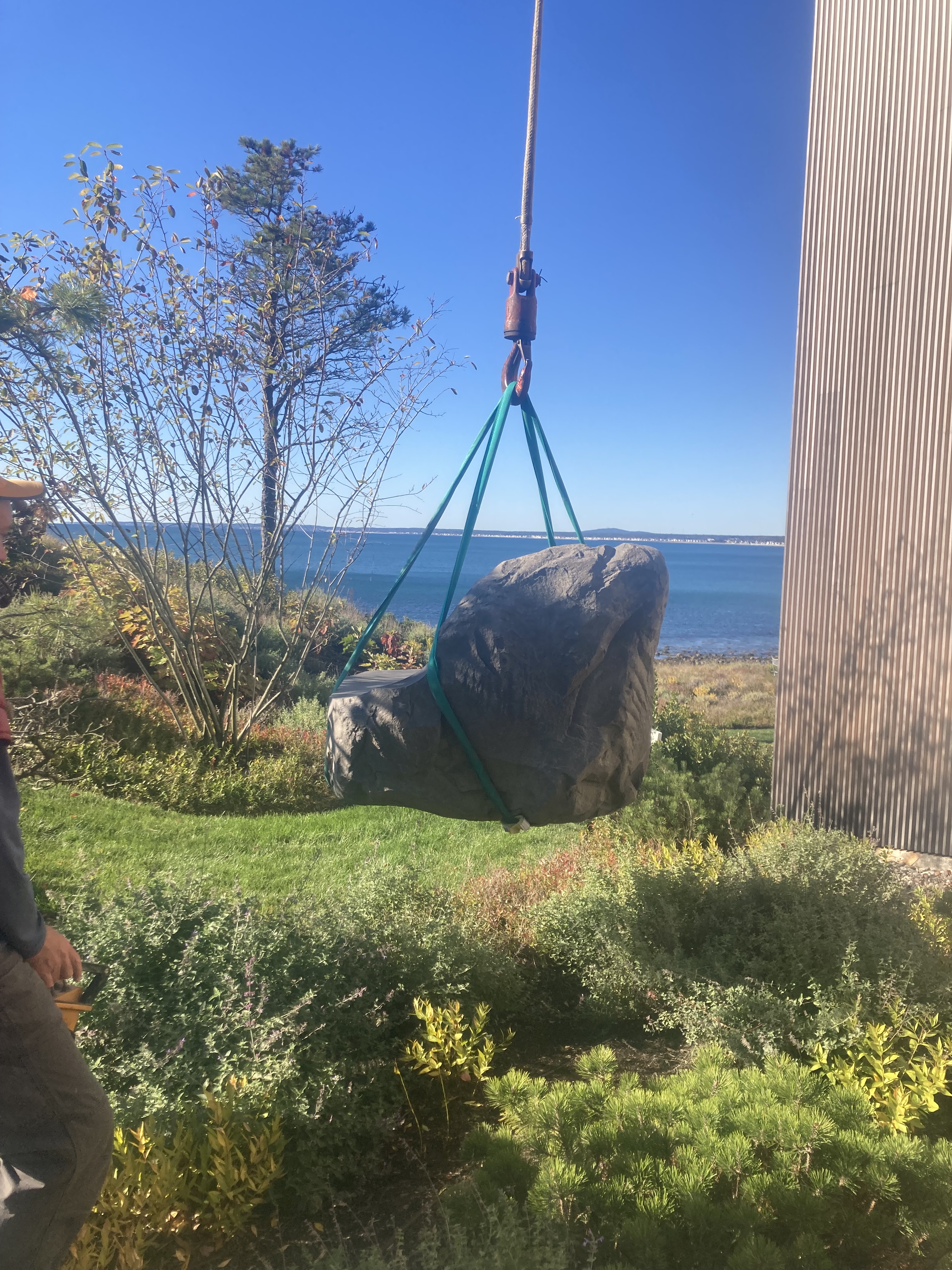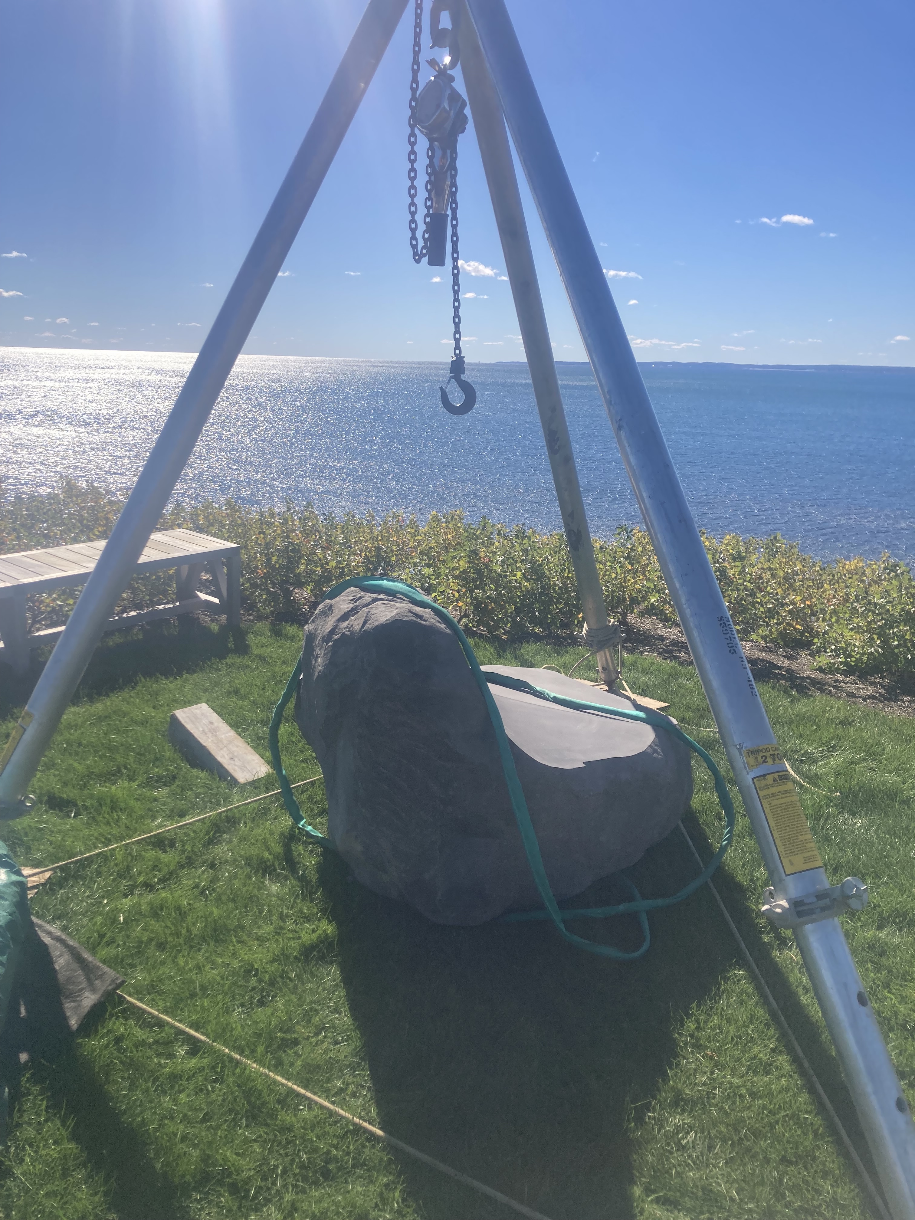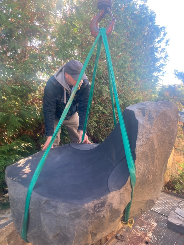 In other news, this week I helped install a sculpture down in Kennebunk. Jesse Salisbury is the esteemed maker of this seat carved from Basalt, a hard black volcanic rock. Heavy lifting 1.5 tons up that hill, but well worth the effort in the end. Ars long, vita brevis.